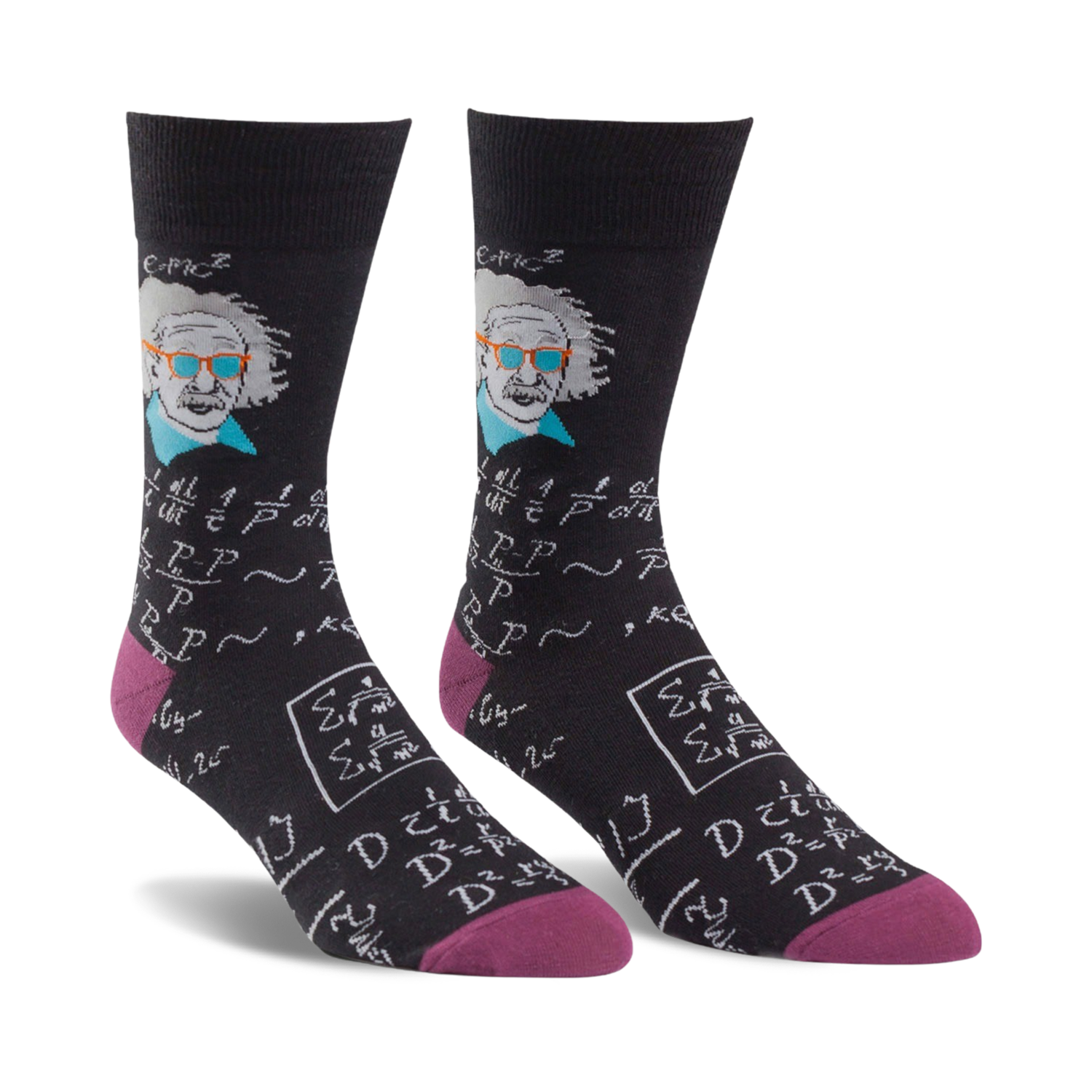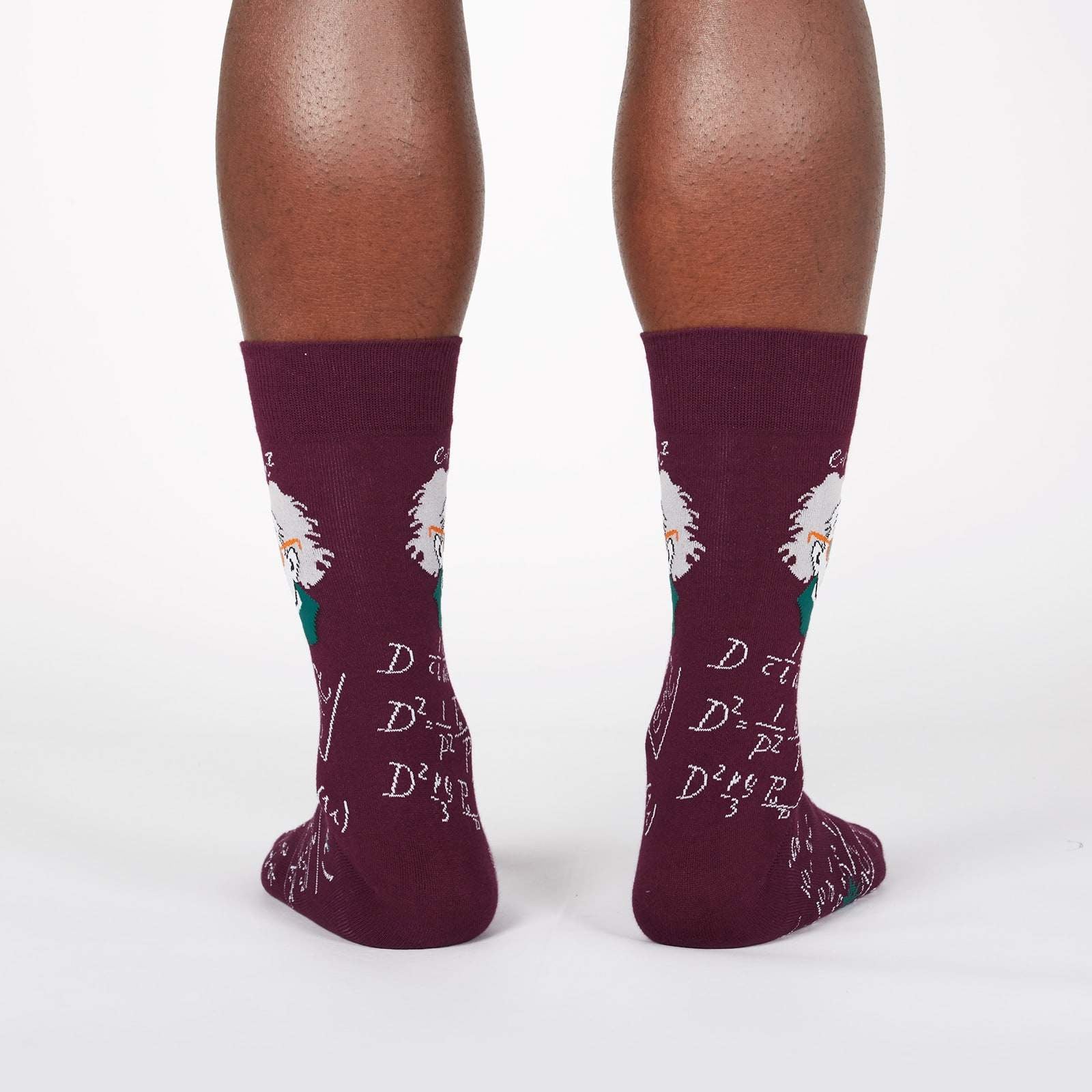Get ready to rock the nerdiest, rad socks on the planet! These maroon crew socks feature Albert Einstein sporting some cool blue shades. Dig the equations and symbols floating around in the background as you channel your inner genius. Talk about #EinsteinSwag!
