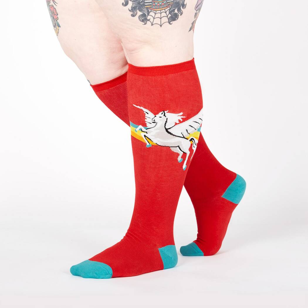 Check out these Retro Pegasus knee-high socks! They're mainly red, with a teal cuff and a cool design featuring a winged horse soaring across a rainbow stripe. The horse is white-ish and looks pretty retro. The socks shown have a small sunburst detail near the cuff, too. These are fun socks to add some personality to your outfit.