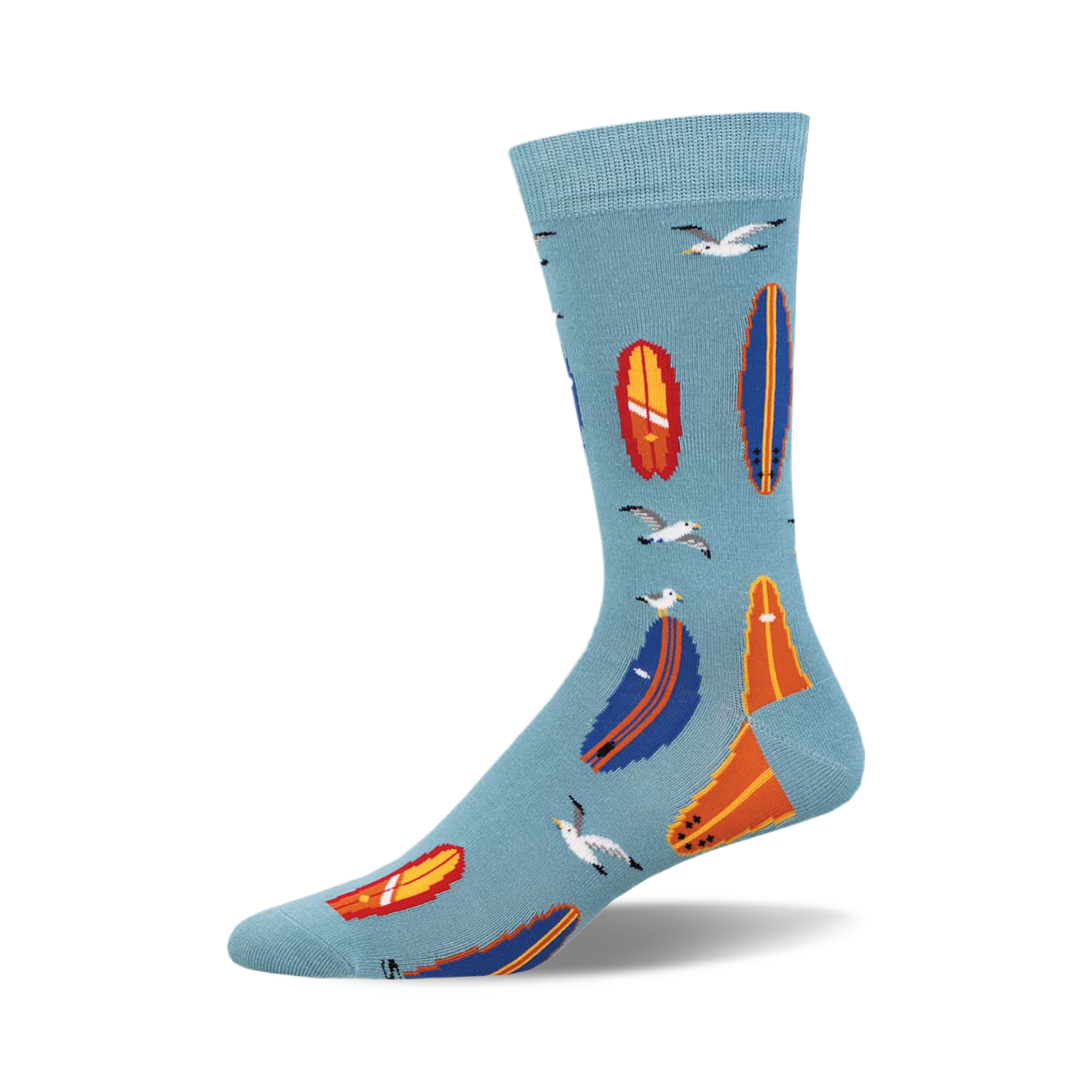 Catch the perfect wave on your feet with our Ride The Wave Bamboo socks! Sporting vibrant orange, blue, and white surfboards with cheeky white seagulls against a cool blue backdrop, these socks scream beach vibes. Perfect for a casual day out or a funky addition to office wear, they're sure to keep your style afloat. Ideal for anyone who wants to keep the surf spirit alive, whether you're floorboarding at work or actually hitting the waves. Why just walk when you can surf your way through the day with every step?