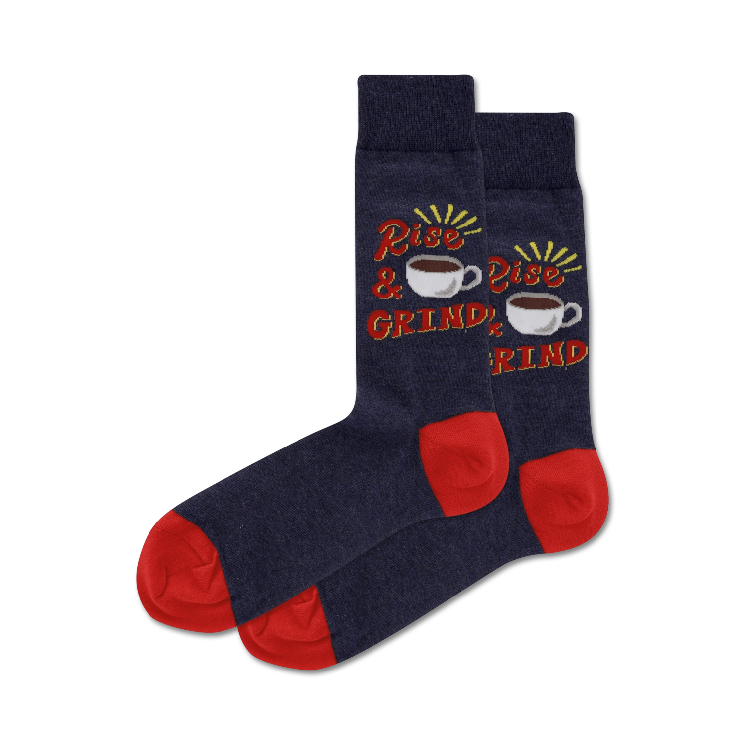 Rise and Grind socks are the perfect way to start your day! These dark blue crew socks with red toes and heels feature a coffee cup with the text "Rise and Grind" on each sock. They're made for men and are sure to put a smile on your face every time you wear them. So kick-start your morning with a cup of joe and a pair of Rise and Grind socks!