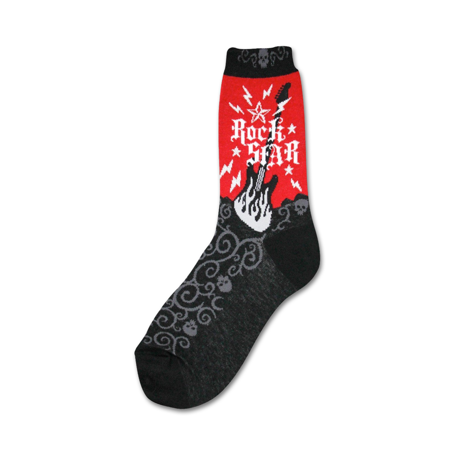 Meet the Rockstar socks! These loud and proud knee-high socks for women are perfect for strutting your stuff on or off the stage. Featuring bold white and yellow lightning bolts, flames, and musical notes over black, these socks will make you feel like a rockstar wherever you go.