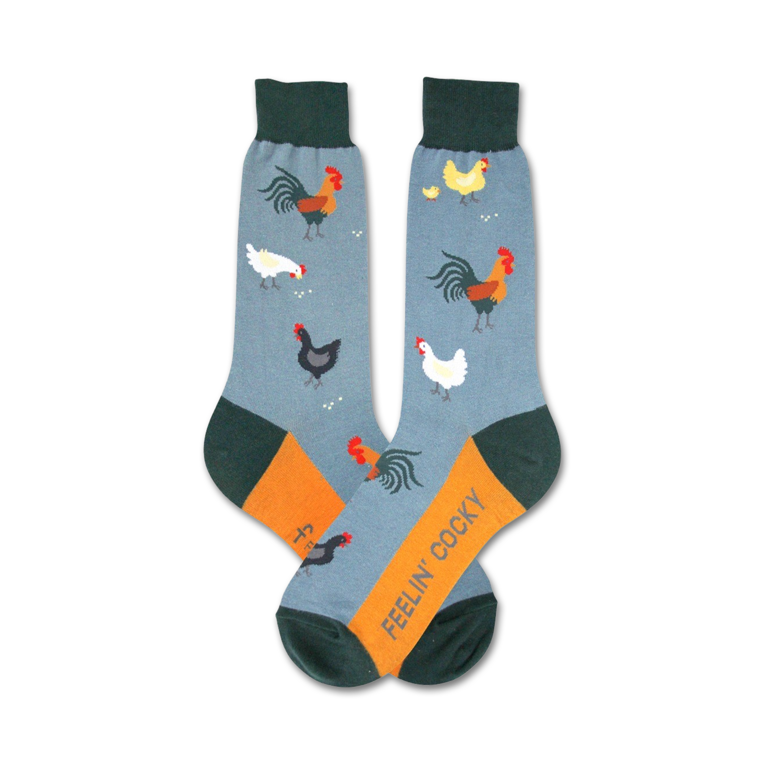 Walk the walk and talk the cluck in these funky Rooster socks. Guaranteed to make your feet the center of attention, these socks strut their stuff with a vibrant blue backdrop and cartoon chooks that are sure to raise a few feathers. Plus, with the playful "FEELIN' COCKY" message emblazoned across the toe, you'll be the cock of the walk wherever you go.