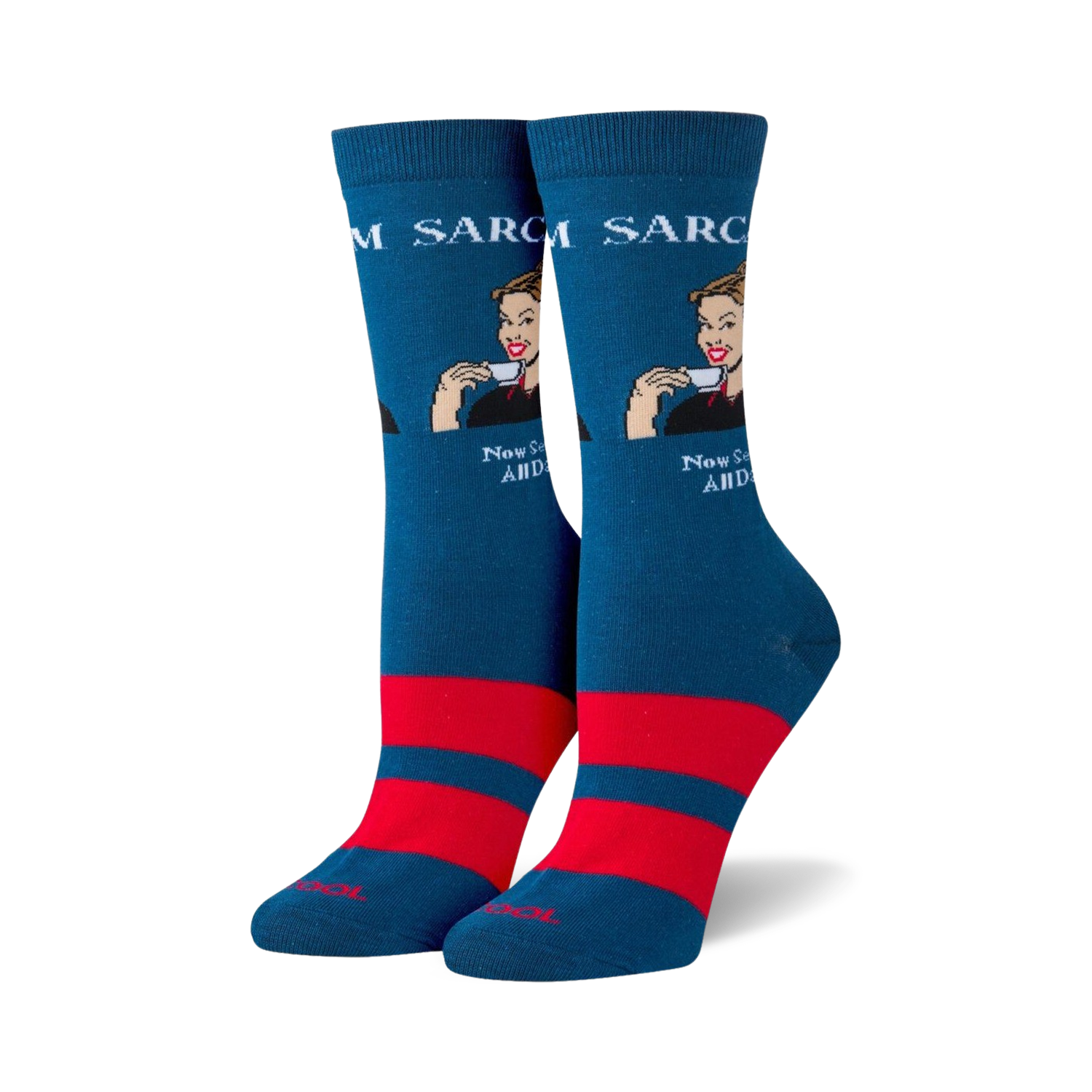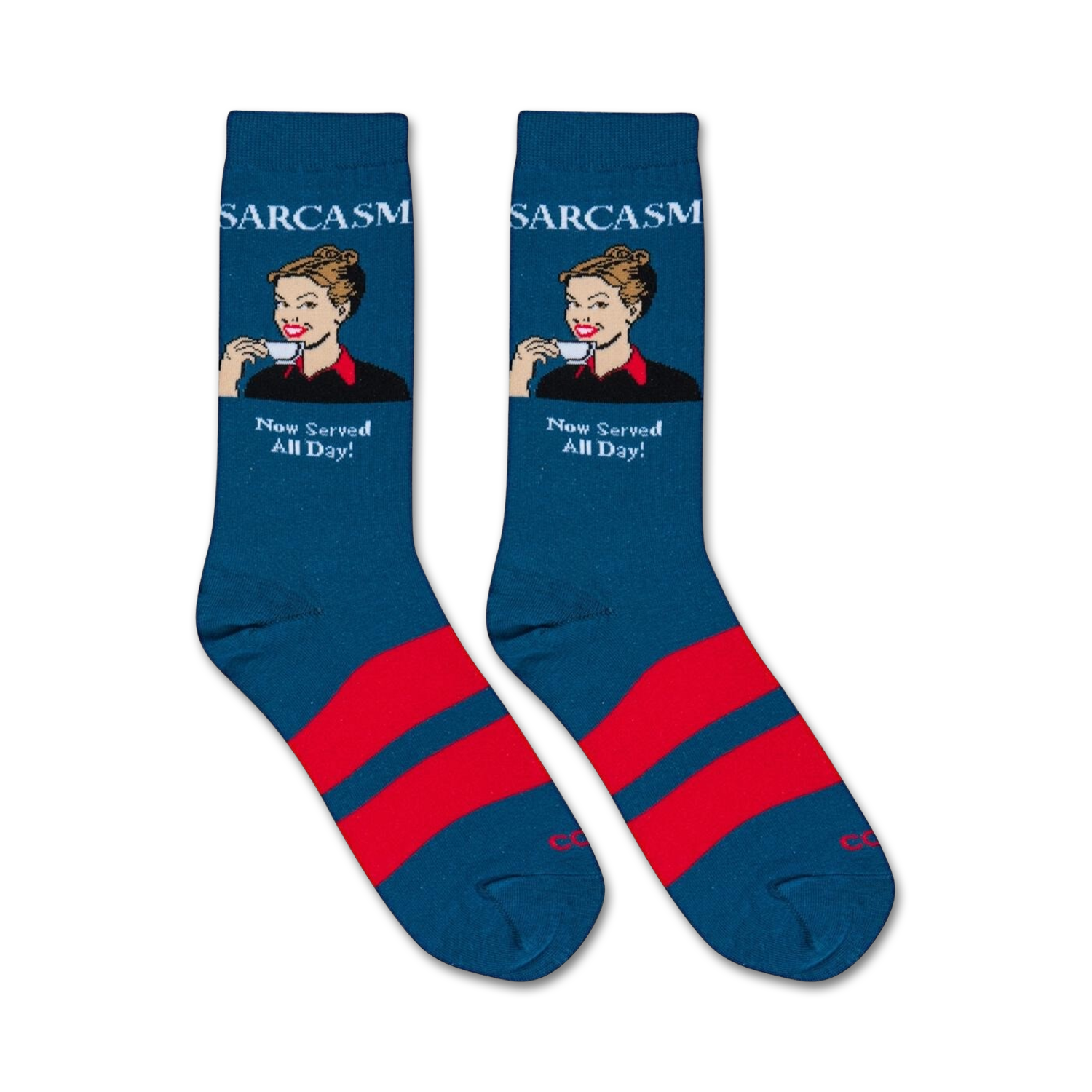 Say Sarcasm. These blue novelty crew socks for women have a red stripe at the top with a red toe and heel. The cartoon drawing of the woman in a blue dress holding a teacup and the words "Sarcasm ¦Now Served All Day!" will have you cracking up.