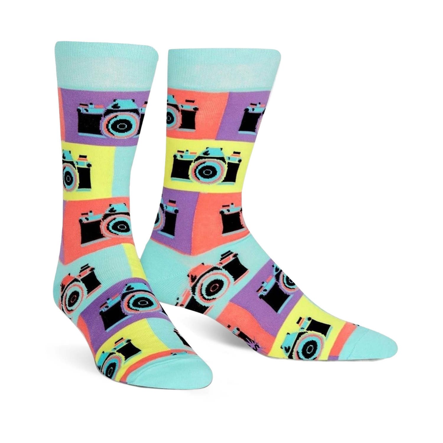 Say "Cheese" and strike a pose in these fun and vibrant socks! Featuring a pattern of black cameras on a blue, pink, yellow, and orange background, these crew-length socks for men are sure to turn heads wherever you go. Rock your love for pop culture and photography with these stylish and cheeky socks.