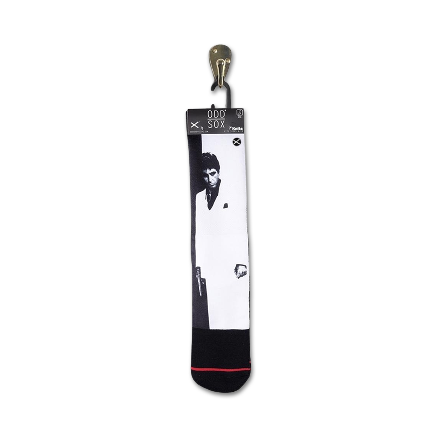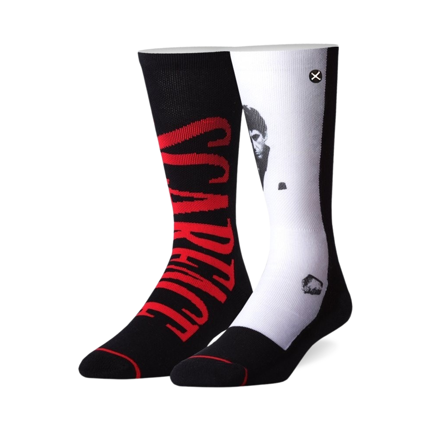 Say hello to the Scarface socks, the baddest socks in the game. Picture this - black and white socks with Tony Montana staring back at you on one foot, while the other sock screams "Scarface" in bold red letters. These socks might make you feel like the king of the world, or maybe initiate a tickle fight with your friends. Who knows, they might even turn you into a ruthless drug lord. But one thing's for sure - you'll be the center of attention wherever you go. Scarface socks - the ultimate power move for your feet!