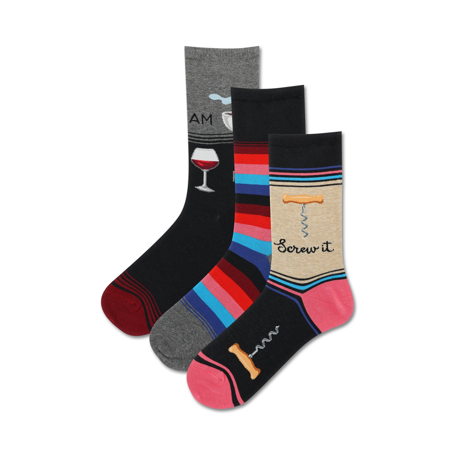 Screw It 3-pack crew socks are the perfect way to celebrate your inner wine enthusiast. With a playful pattern of red, blue and light blue horizontal stripes, a wine glass, and a corkscrew, these socks are sure to get a smile. Whether you're enjoying a glass of wine with friends or just want to add a little fun to your sock drawer, these socks are the perfect choice. Plus, they're made for women, so you can be sure they'll fit just right!