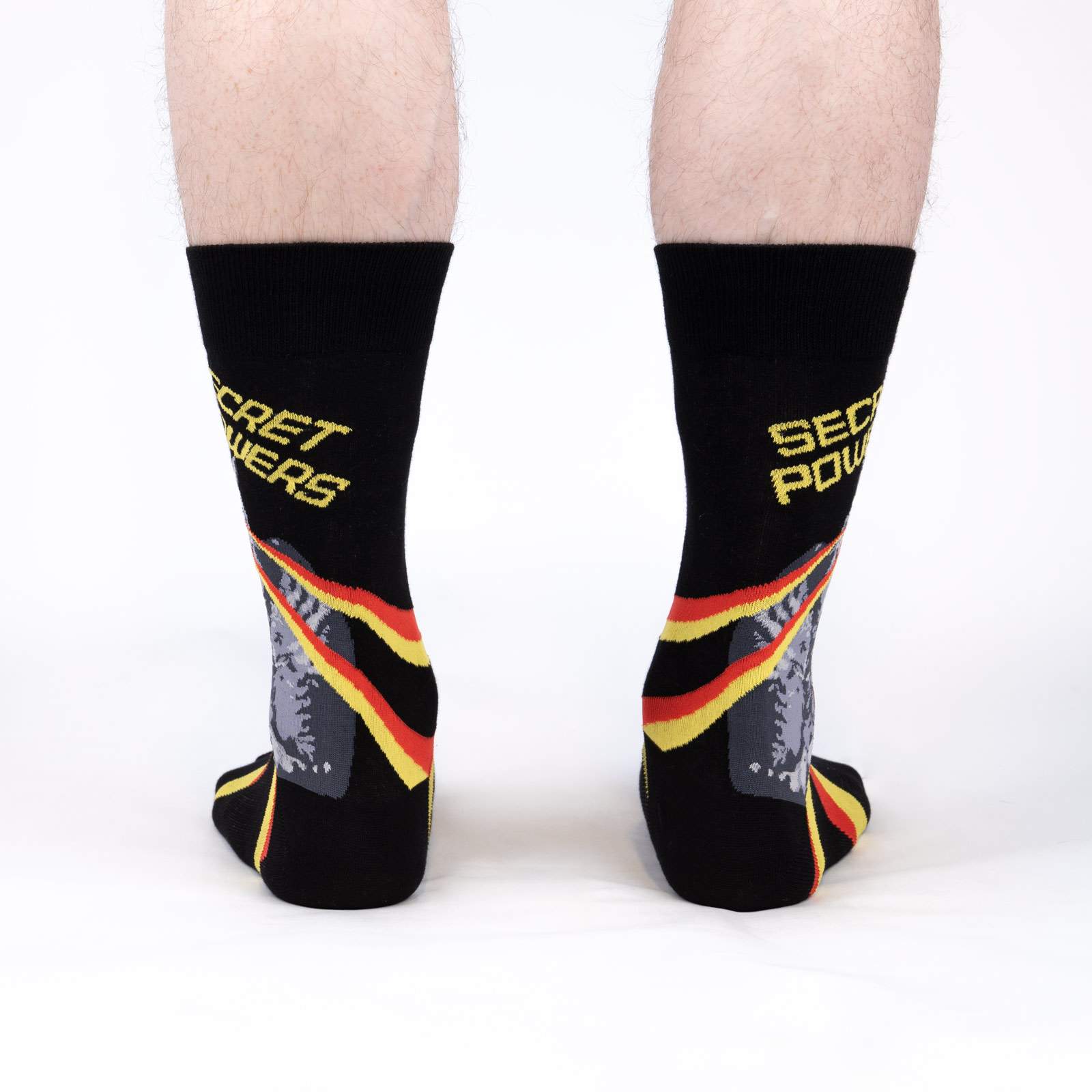 Unleash your secret powers with these extraordinary socks! Picture this: a black canvas graced with a determined grey cat sporting a majestic red cape. As its piercing eyes shoot a rainbow laser beam, you'll feel invincible! The words "Secret Powers" emblazoned in bold yellow and red above the cat serve as a constant reminder of your inner strength. These crew-length socks for men are the purr-fect accessory to unleash your hidden potential and add a dash of feline flair to your everyday adventures.
