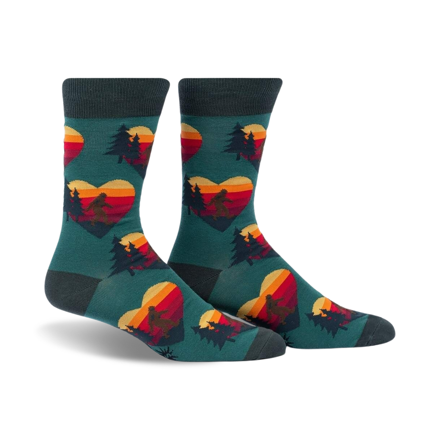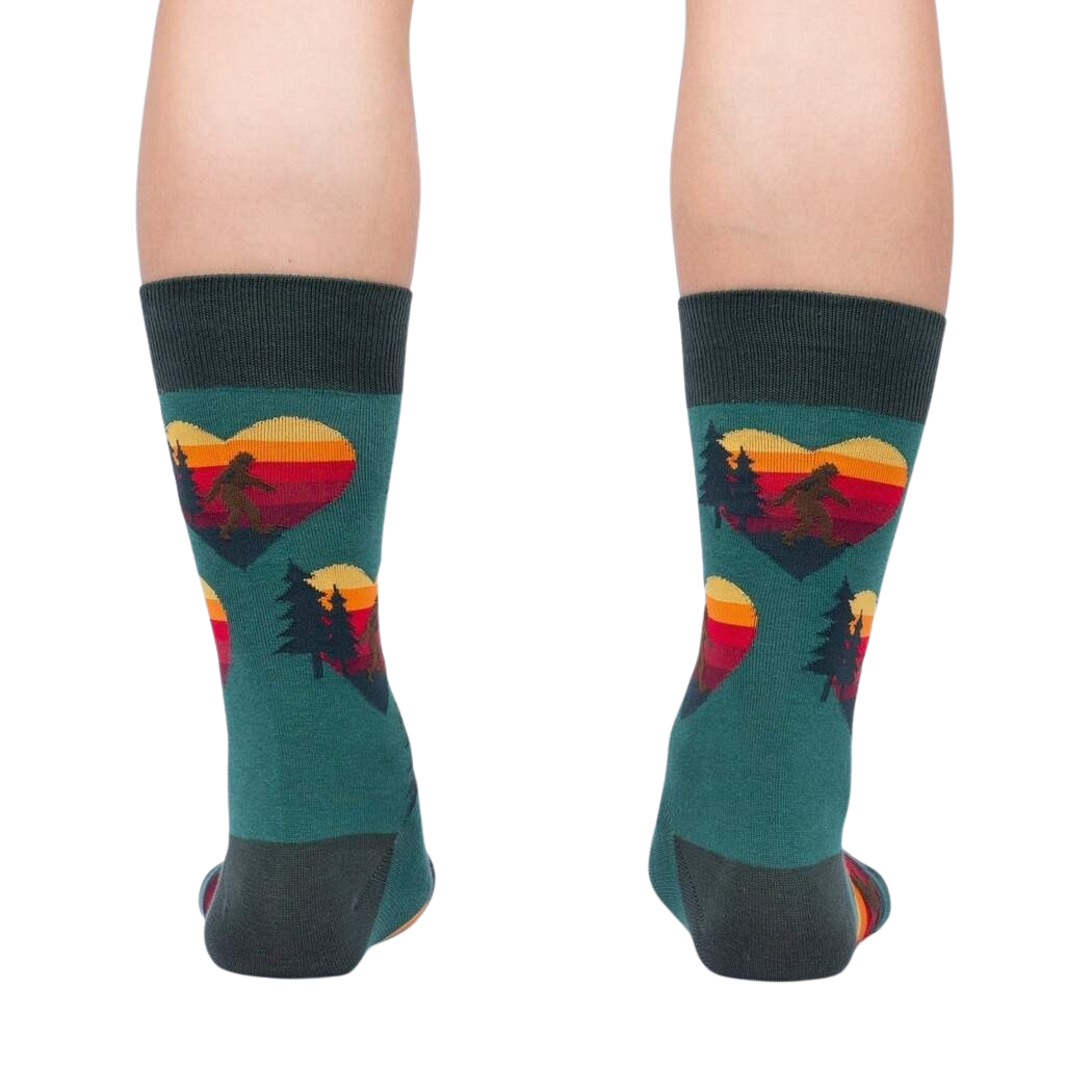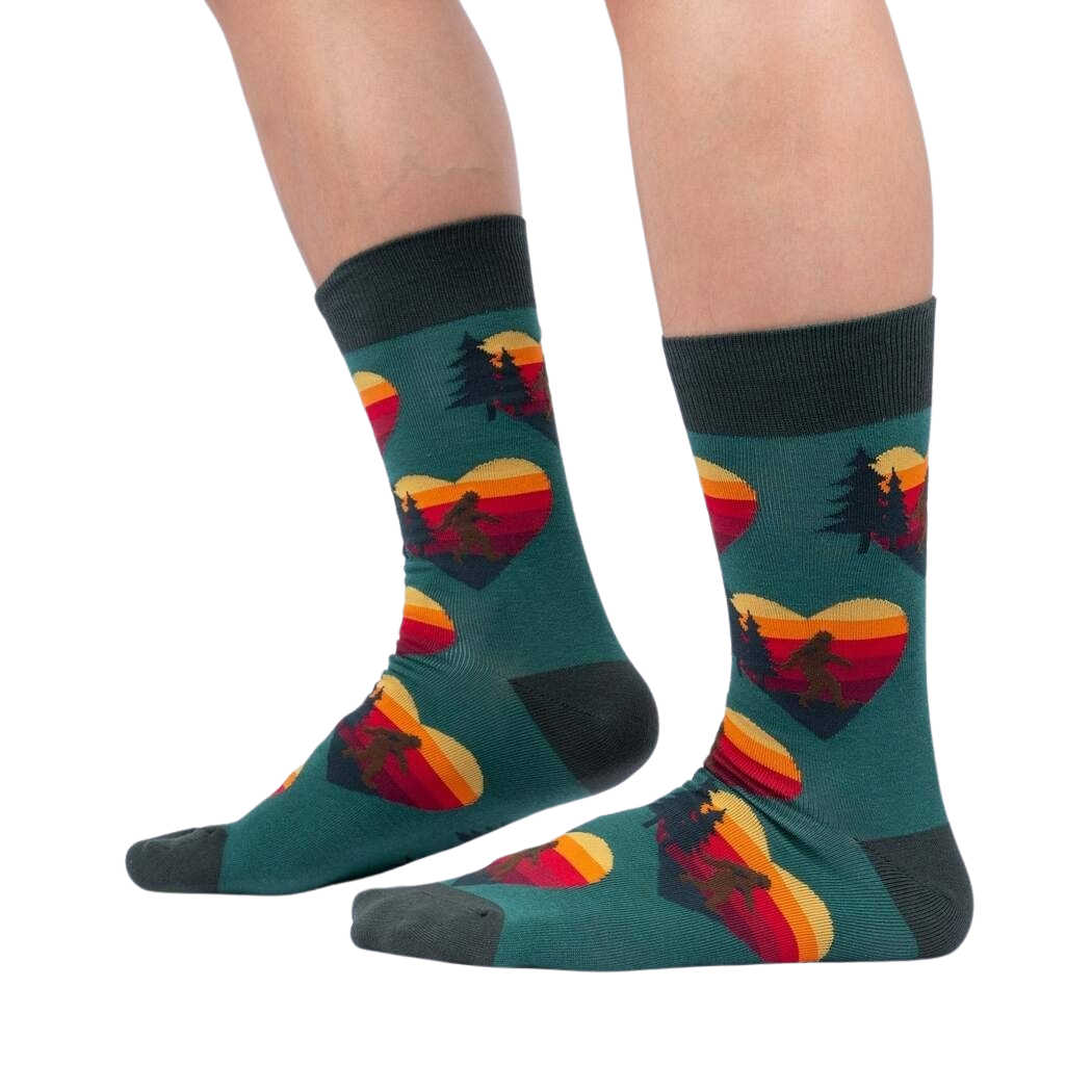 Have you ever seen Bigfoot? No? Well, now you can at least wear him! These Seeking Sasquatch crew socks feature a pattern of red, orange, and yellow hearts. Inside each heart is a silhouette of the elusive creature walking through pine trees with a sunset in the background. So next time you're out hiking, camping, or just lounging around the house, you can keep your feet warm and stylish while you search for the legendary Bigfoot.