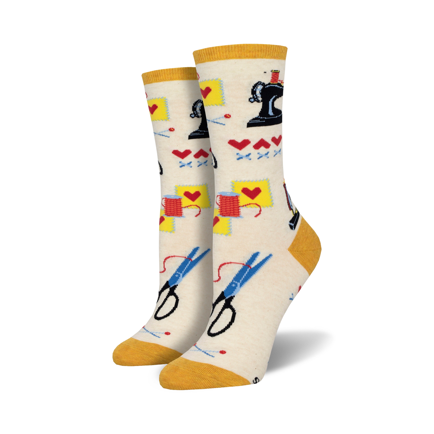 Sew In Love Novelty Socks: Fall head over heels for our Sew In Love socks! These off-white crew socks feature a colorful pattern of scissors, thread, sewing machines, and hearts, making them a fun and stylish choice for any sewing enthusiast. Show off your passion for stitching with these cozy companions designed to bring a smile to your face. From beginner sewers to fashionistas, these socks will keep your feet comfortable and your style on point!