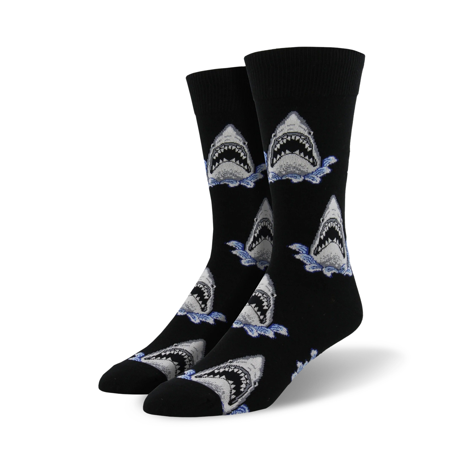 When you are swimming in the ocean and spot a fin out of water, this is probably the first thing that pops into your head! These cool socks will add some real bite to your style. Each wild pair of blue crew socks features a pattern of large blue-eyed sharks emerging from the water to catch their prey.