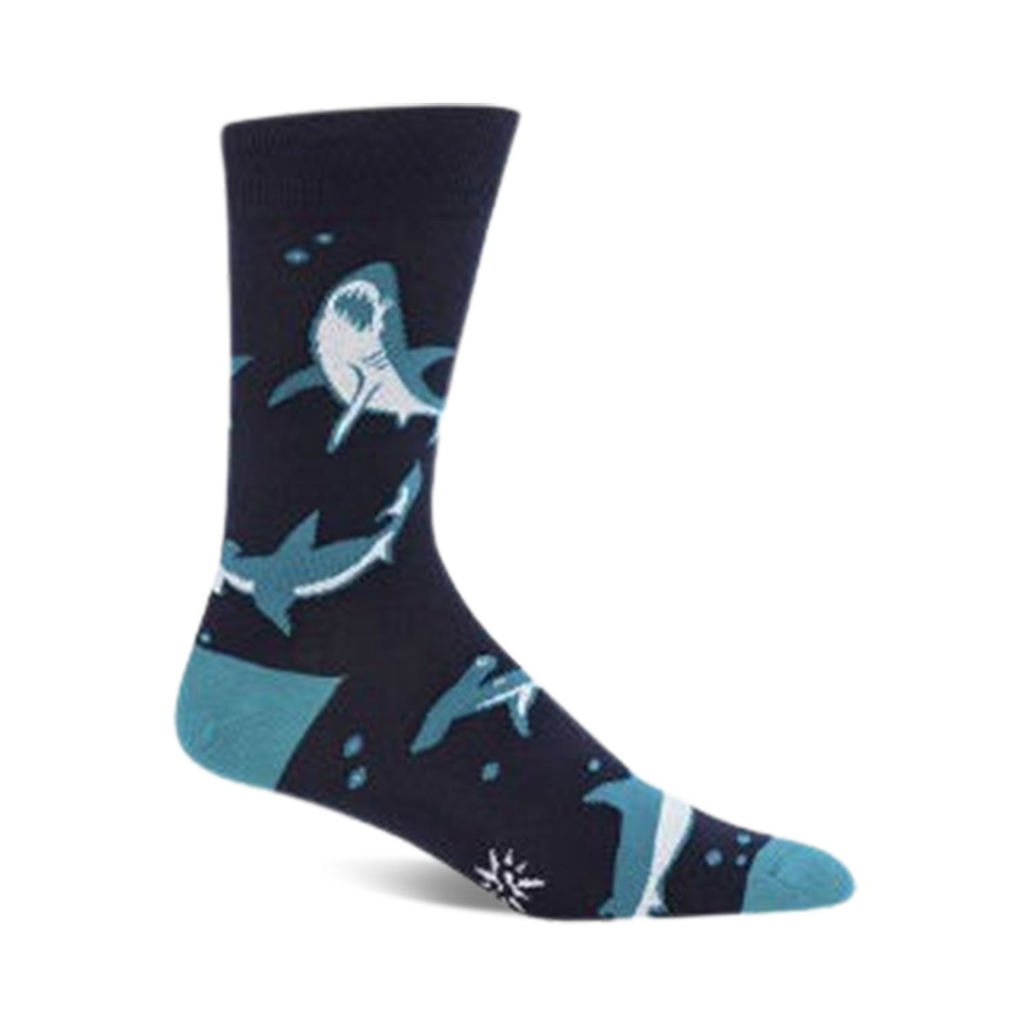 Dive into the deep end with our "Shark Attack" novelty socks! With a vibrant blue background and fierce grey sharks swimming in all directions, these socks will make a big splash wherever you go. Perfect for any shark enthusiast or adventurer, these crew-length socks for men are sure to keep your feet feeling fin-tastic all day long. So, dive in and let the sharks take you on a wild ride!