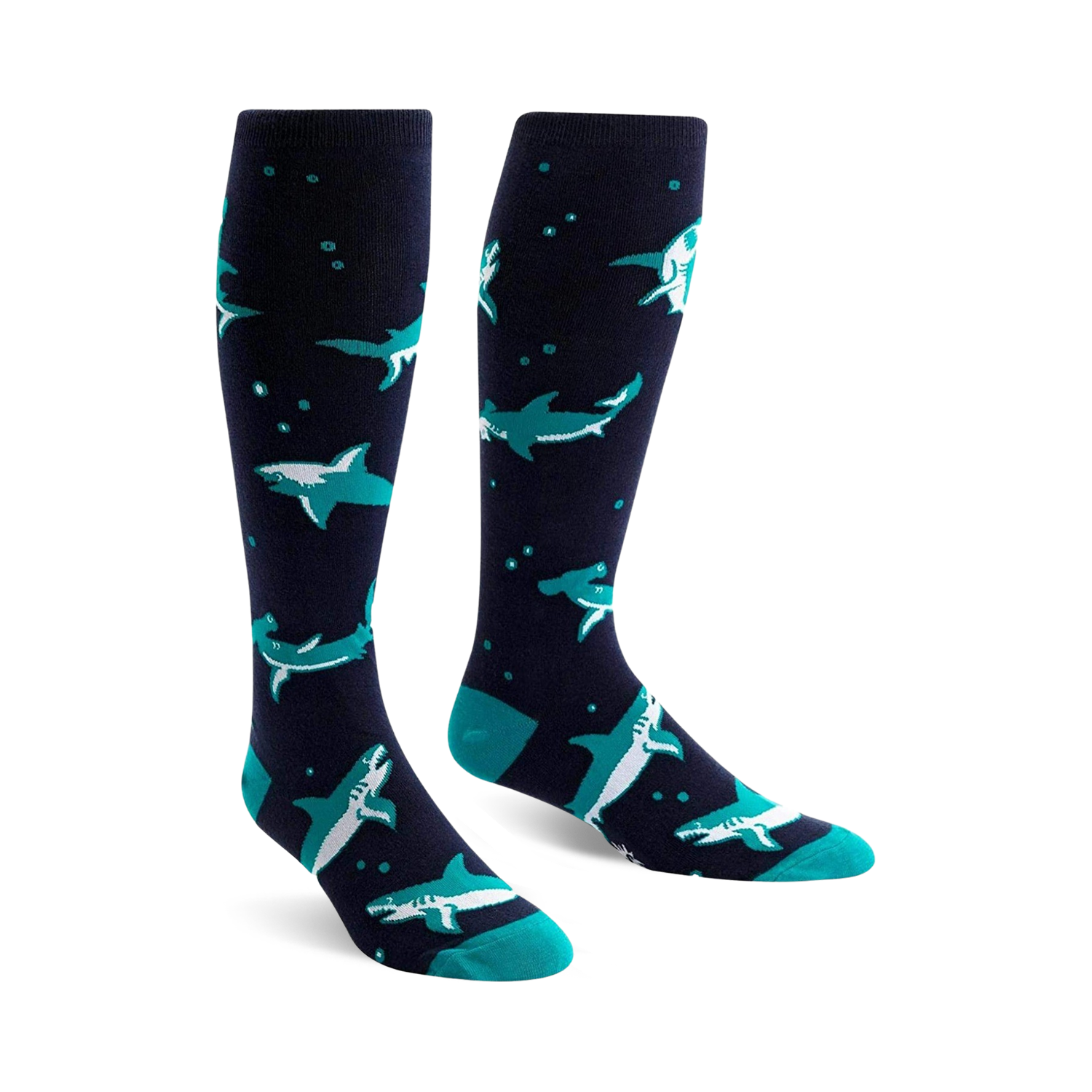 Dive into the deep blue with our "Shark Attack" novelty socks. Featuring a school of cartoon sharks swimming in different directions, these knee-high socks will make a splash wherever you go. Get ready to make waves and turn heads with this fin-tastic design.