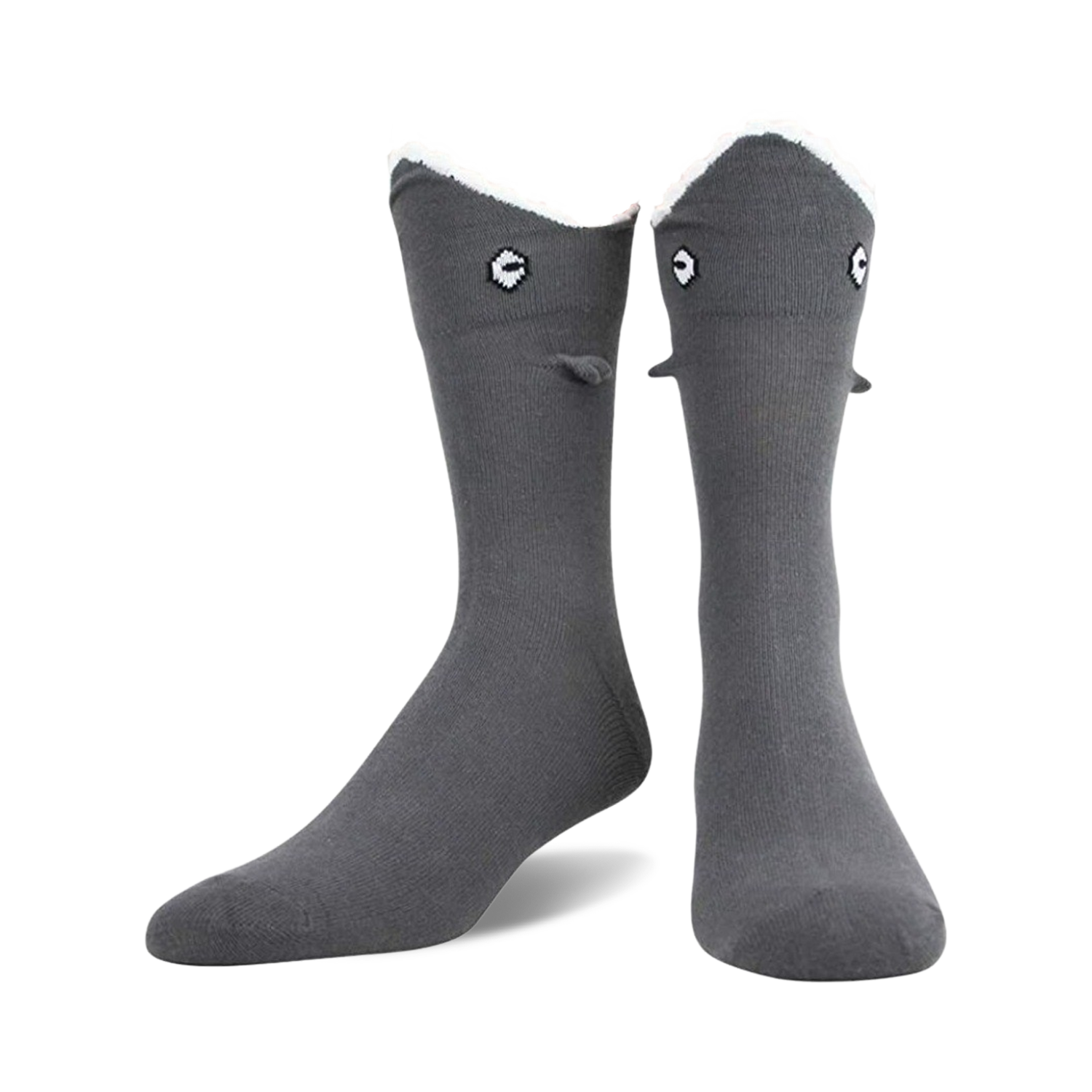 Dive into the deep end of style with our Shark Bite 3D socks. These gray crew socks feature a white cuff and a 3D shark face with black eyes and an open mouth revealing white teeth. Slip on a pair of these socks and let the jaws of fashion sink their teeth into your feet. Who needs the ocean when you can have killer style on land?