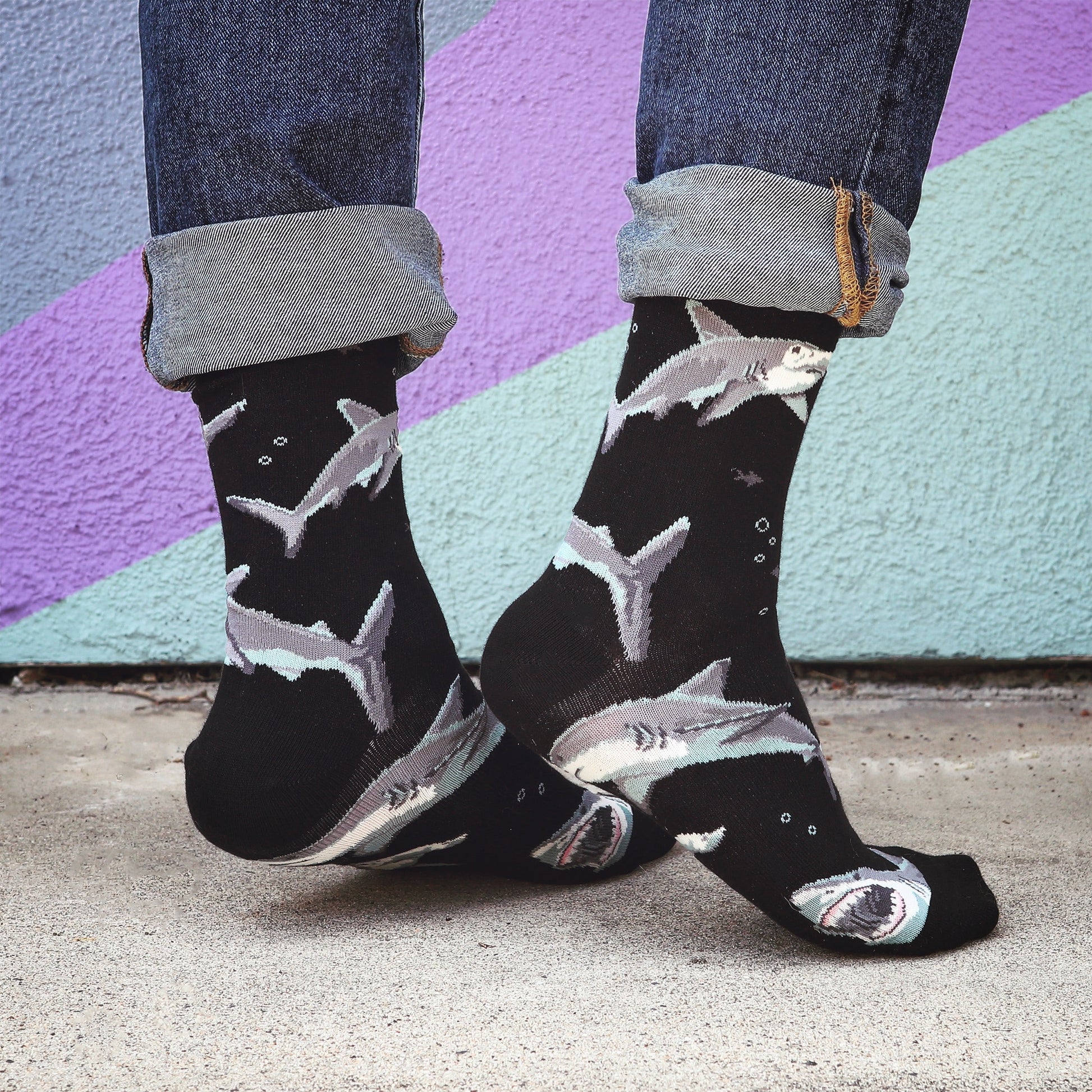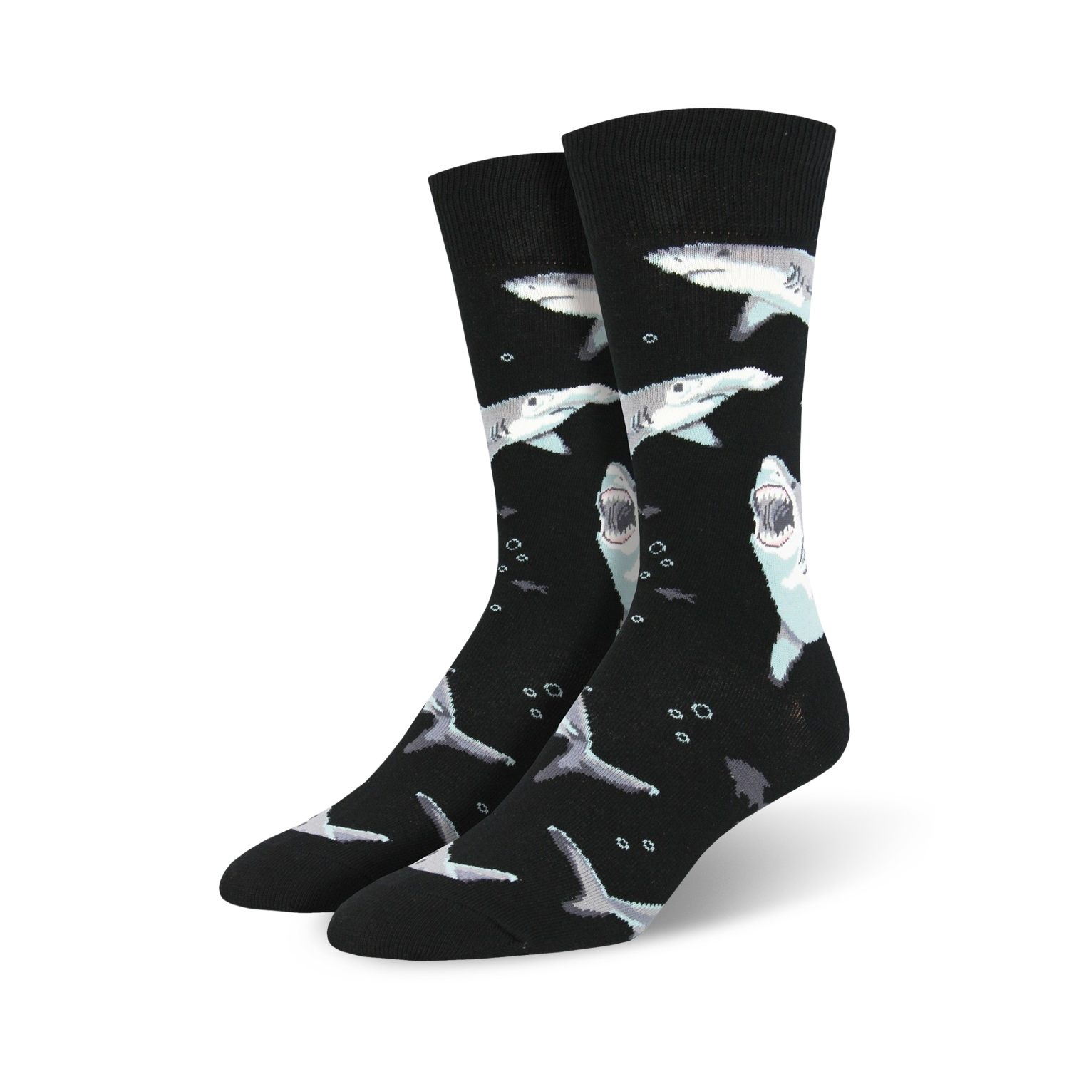Who doesn't love the fearsome great white shark? Great white sharks are powerful and cunning. They are the king of the sea! Shark fans need a pair of these cool men's novelty crew socks in their sock drawer. Each awesome pair features sharks printed all over against an eye-catching red background.