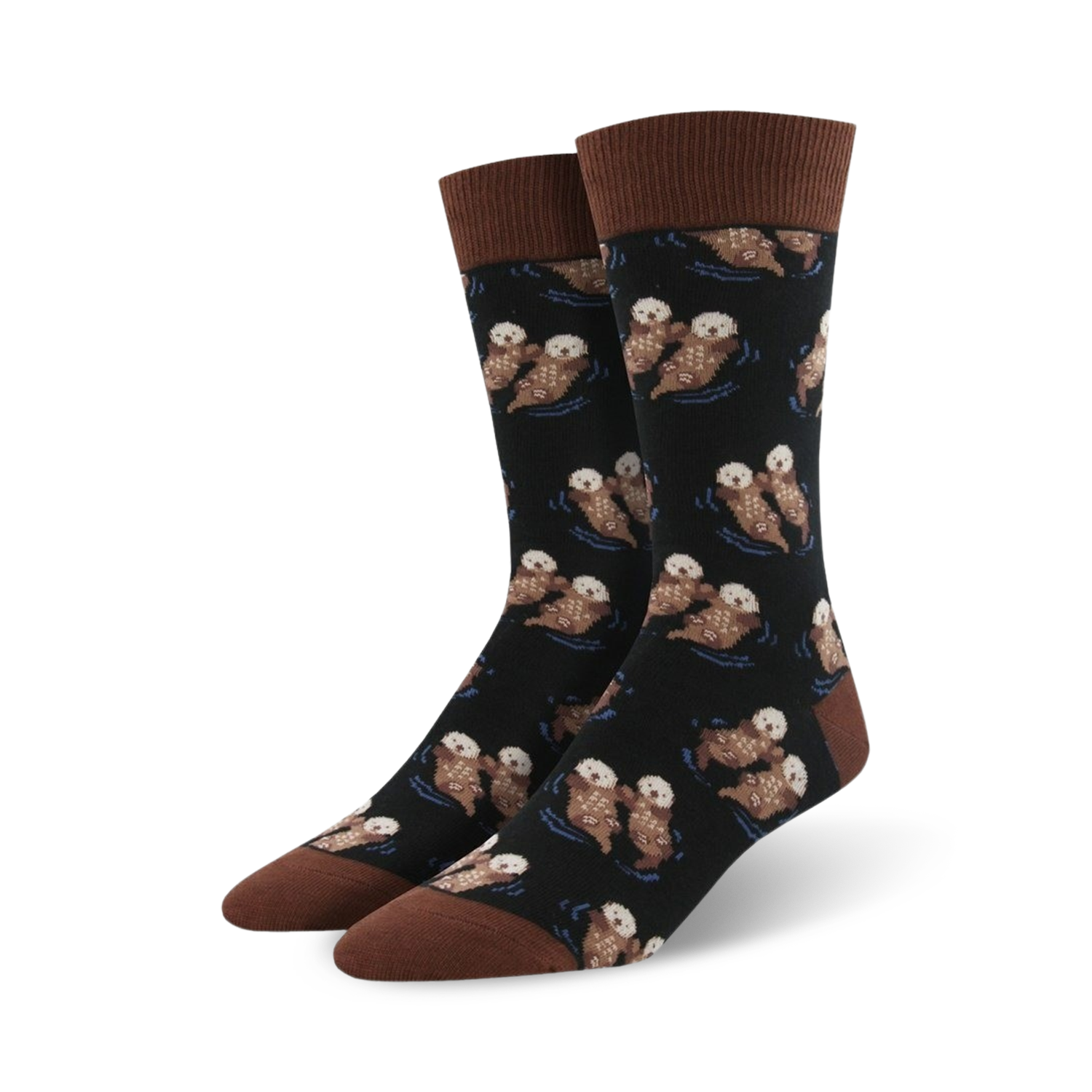 Looking for the perfect gift for your significant otter? Why not gift them these cool, punny socks! Each awesome pair of men's novelty crew socks feature otter couples that are floating around and printed all over against a black background. The cuffs, heels, and toe lines are brown.