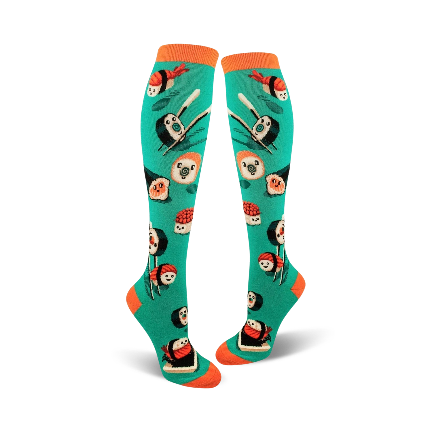 With Silly Sushi socks, knee high, you can finally walk around with sushi on your feet and never finish it! Raw fish, rice, and seaweed never looked so good. And with these socks, made for women, you won't have to share your bites with your friends. Because, let's face it, if you have a friend that wants to steal your sushi socks, that's just a recipe for disaster.