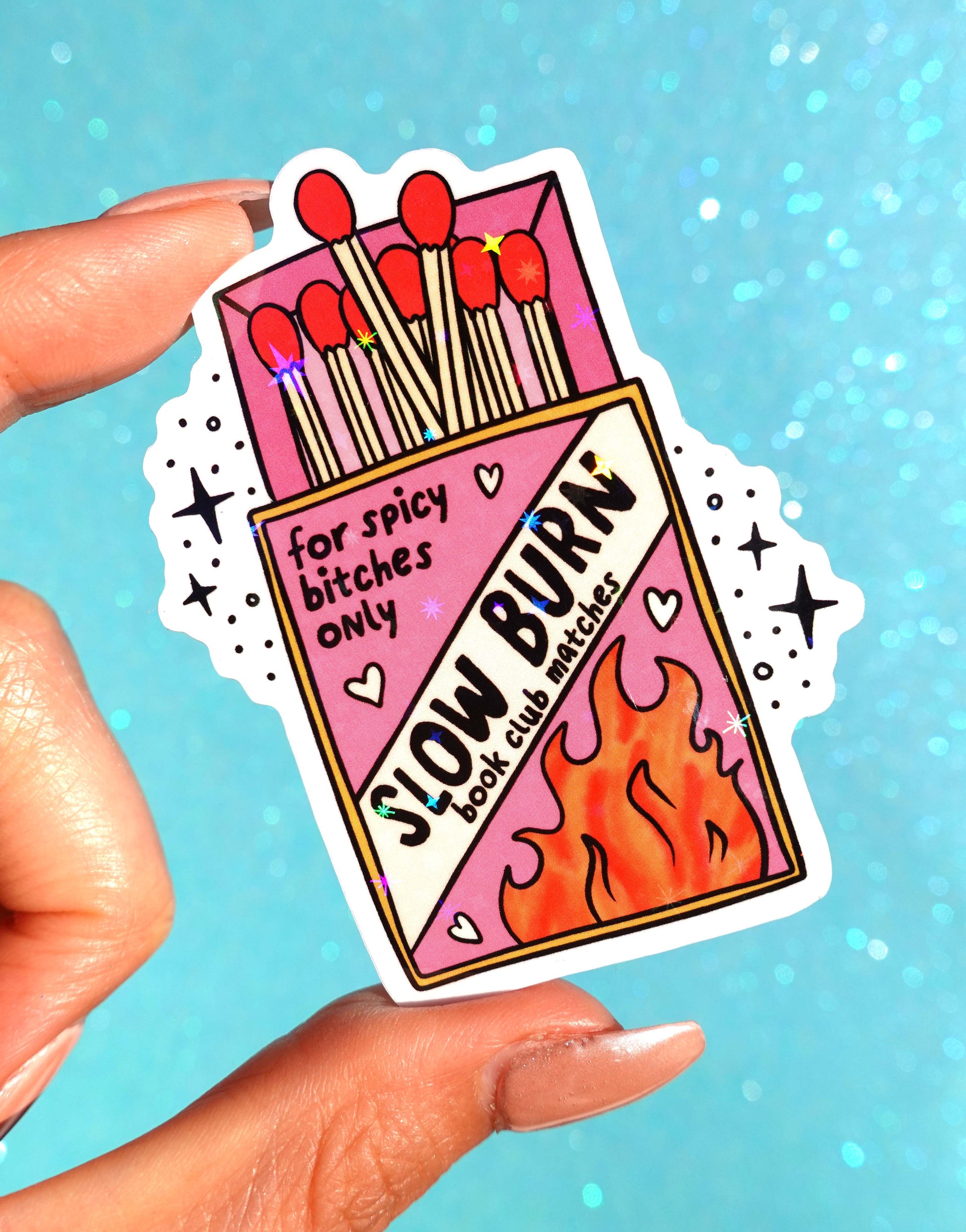 For readers who like it drawn out and delicious. This glitter vinyl sticker features a matchbox design labeled “Slow Burn Book Club Matches – For Spicy Bitches Only.” Cheeky, sparkly, and bookish, it’s perfect for spicy romance fans, BookTok readers, and sticker collectors who love a little sass with their sparkle.