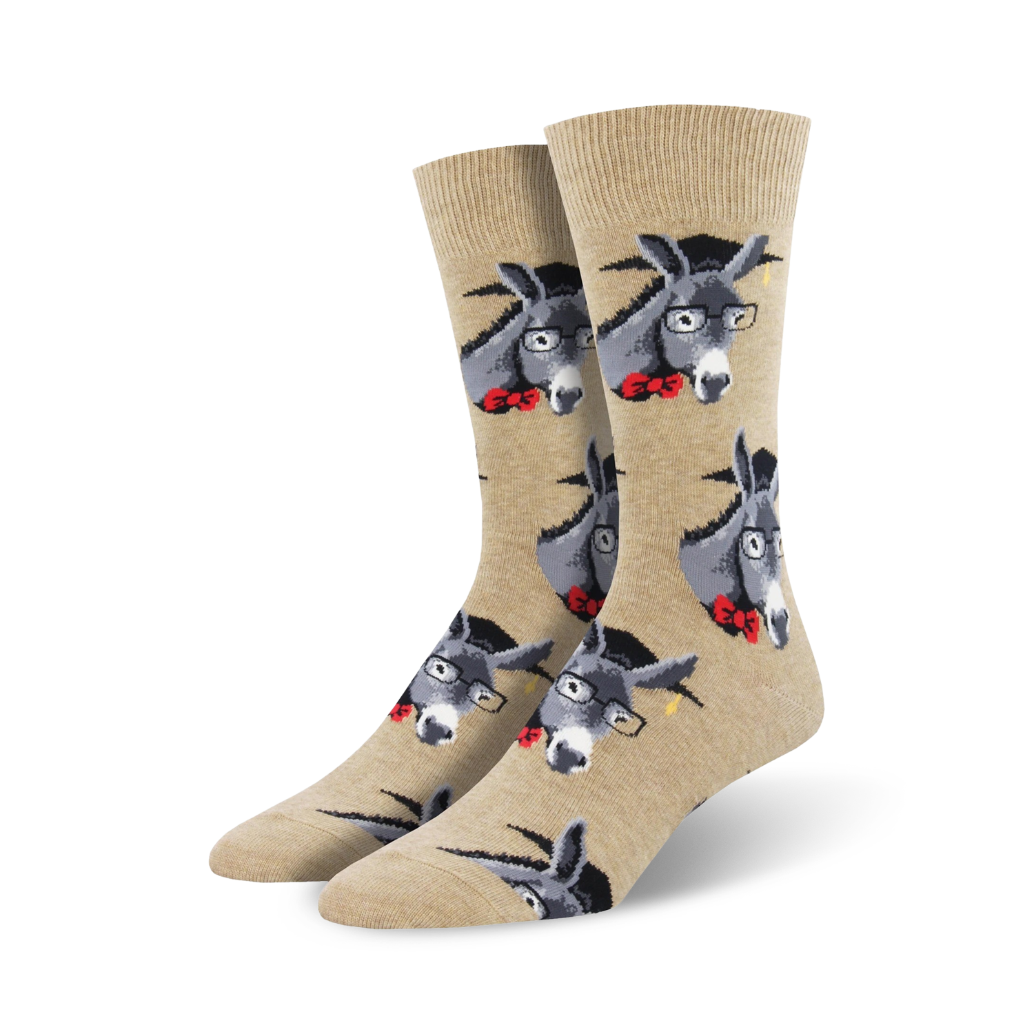 Heads up! Say hello to our Smart Ass XL crew socks. Picture this: a parade of cartoon donkeys prancing across your feet, each one sporting a dapper red bow tie and stylish black eyeglasses. No more boring, plain socks for you. These light tan beauties will make you the center of attention wherever you go. Plus, they're made for men with XL feet, so you can show off your smart style in comfort. Donkey around and grab a pair today!