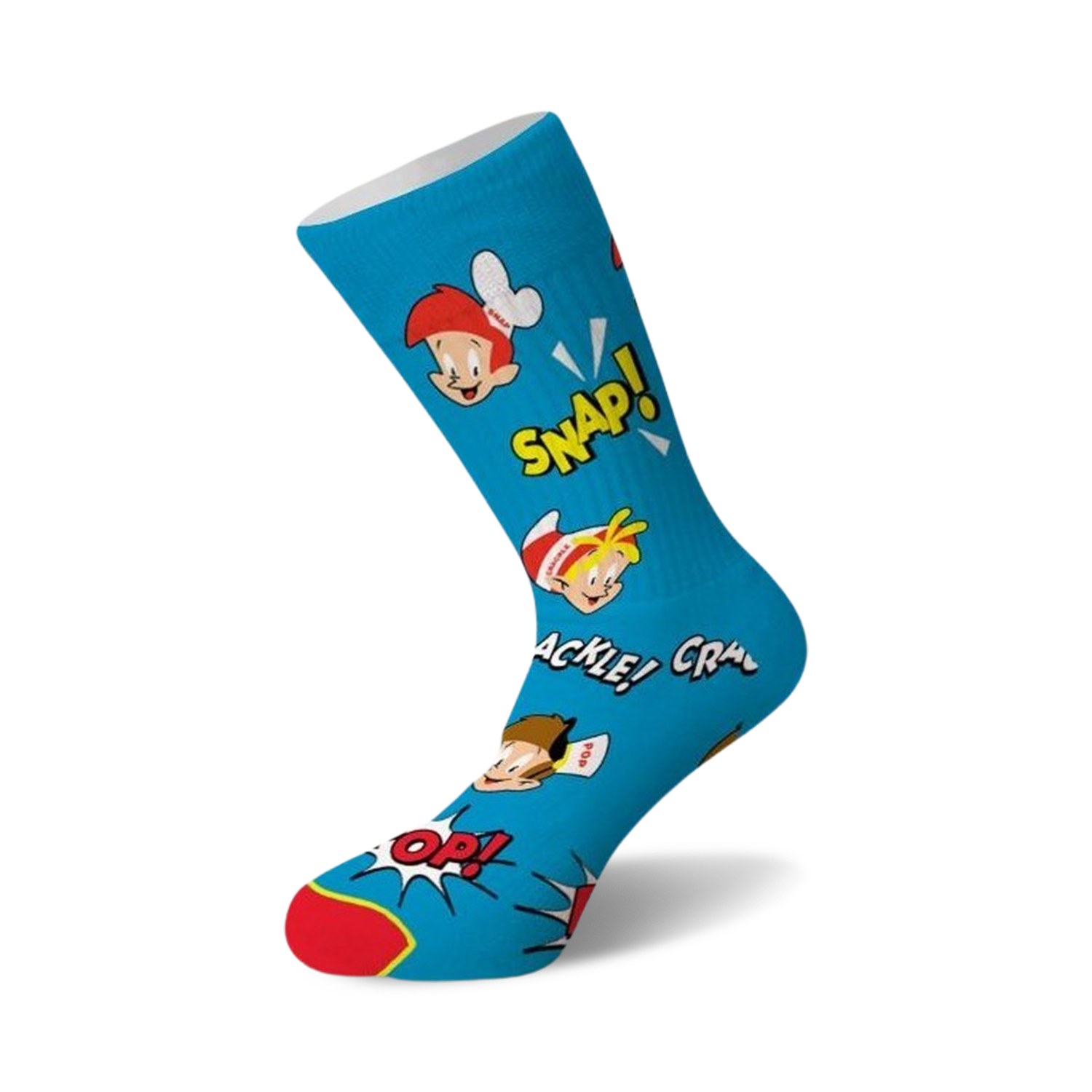 Snap your fingers, crack a smile, and pop your feet into these Rice Krispies socks. Representing your favorite breakfast cereal, these blue socks feature a pattern of Snap, Crackle, and Pop, plus a red toe and heel with a white top. With their iconic Rice Krispies characters, these comfy crew socks are great for breakfast, lunch, and dinner.