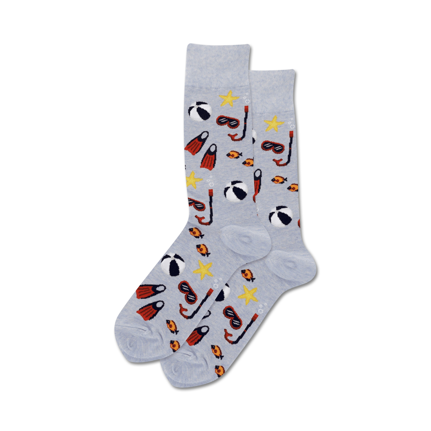 Dive into the world of Snorkel socks with these crew-length beauties! Picture this: a gray sock canvas adorned with a vibrant pattern of red and orange fish, yellow and red beach balls, black and gray snorkels, and blue flippers. These fishy friends will keep your feet company and inspire you to explore the underwater world even when you're landlocked. You won't be floundering in style with these socks on!