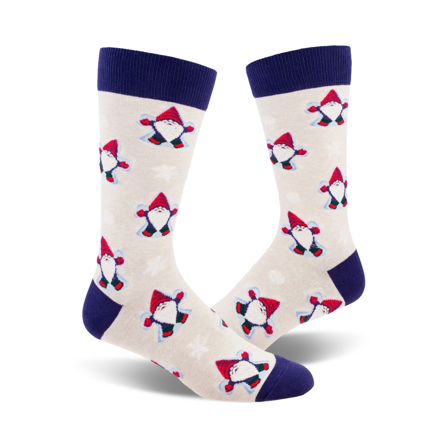 Calling all gnome enthusiasts and snow angels in training! Strap on these Snow Gnome Crew Socks and let the frosty fun begin. These white socks feature a jolly crew of red and purple gnomes frolicking in a snowy wonderland, creating snow angels that would make even the most skilled snow angel maker envious. Slip into a pair of these whimsical socks and let the magic of the season (or any season, really) fill your feet with joy!