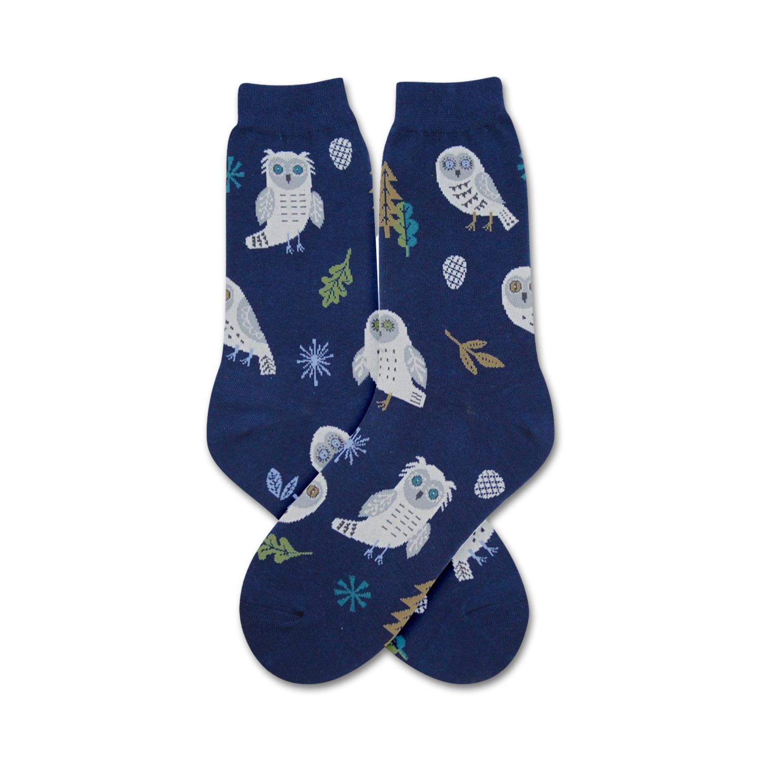 Snowy Owl socks: Fly into snowy bliss! These cozy dark blue crew socks for women feature a winter wonderland of snowy owls, frosty pine cones, delicate snowflakes, and crisp leaves, all brought to life with joyful white, blue, yellow, brown, and green details. Wrap yourself in the wintry magic of Snowy Owl socks, and let your feet experience the tranquility of a snowy landscape.
