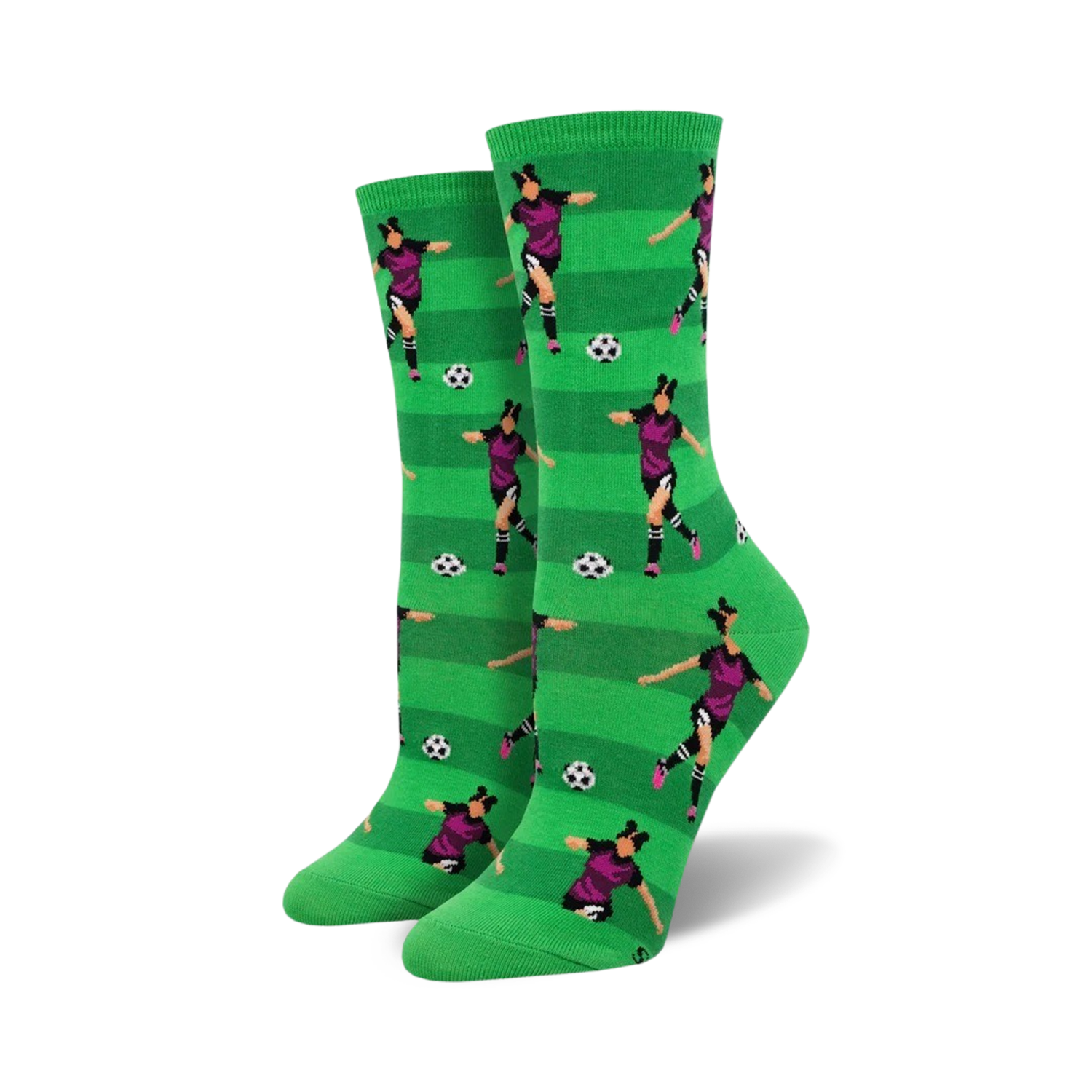 Slide into a game-changer with these vibrant green crew socks, showcasing kickin' female soccer players in mid-action! They're not just socks; they're your ticket to showing off your love for the game with flair. Who knew feet could be this fun? Perfect for soccer enthusiasts, these socks are ready to steal the spotlight on and off the field. Get ready to kick up your style and score some serious fashion goals!