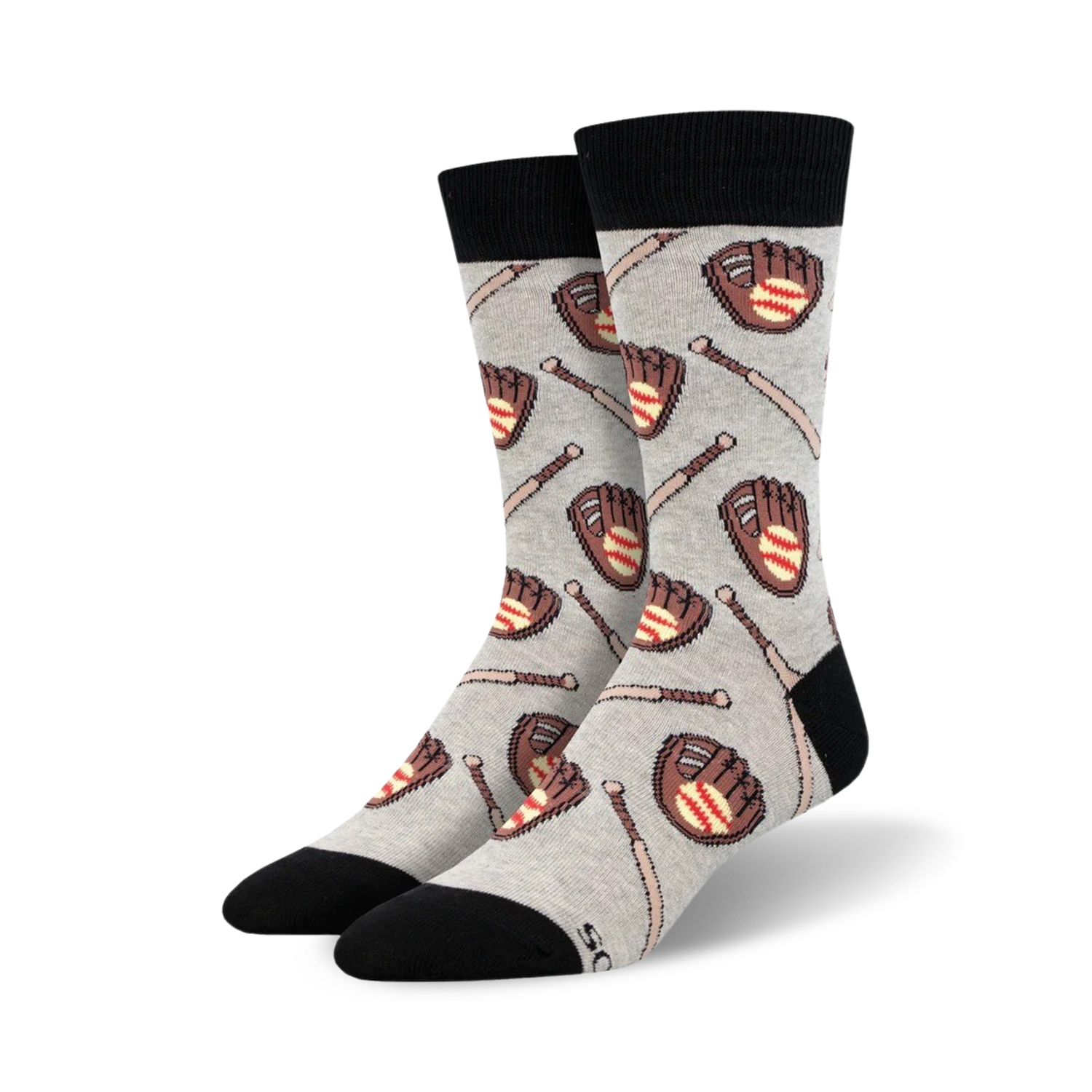 Batter up! If you're ready to hit it out of the park, grab a pair of these novelty Softball League Crew Socks for Men. These eye-catching brown and tan athletic-themed crew-length mens' novelty softball-themed crew-length dress athletic casual shoes have a pattern of softballs, bats, and catcher's mitts and are a real-home run for sport and fashionistas who want to slide into something a little different.