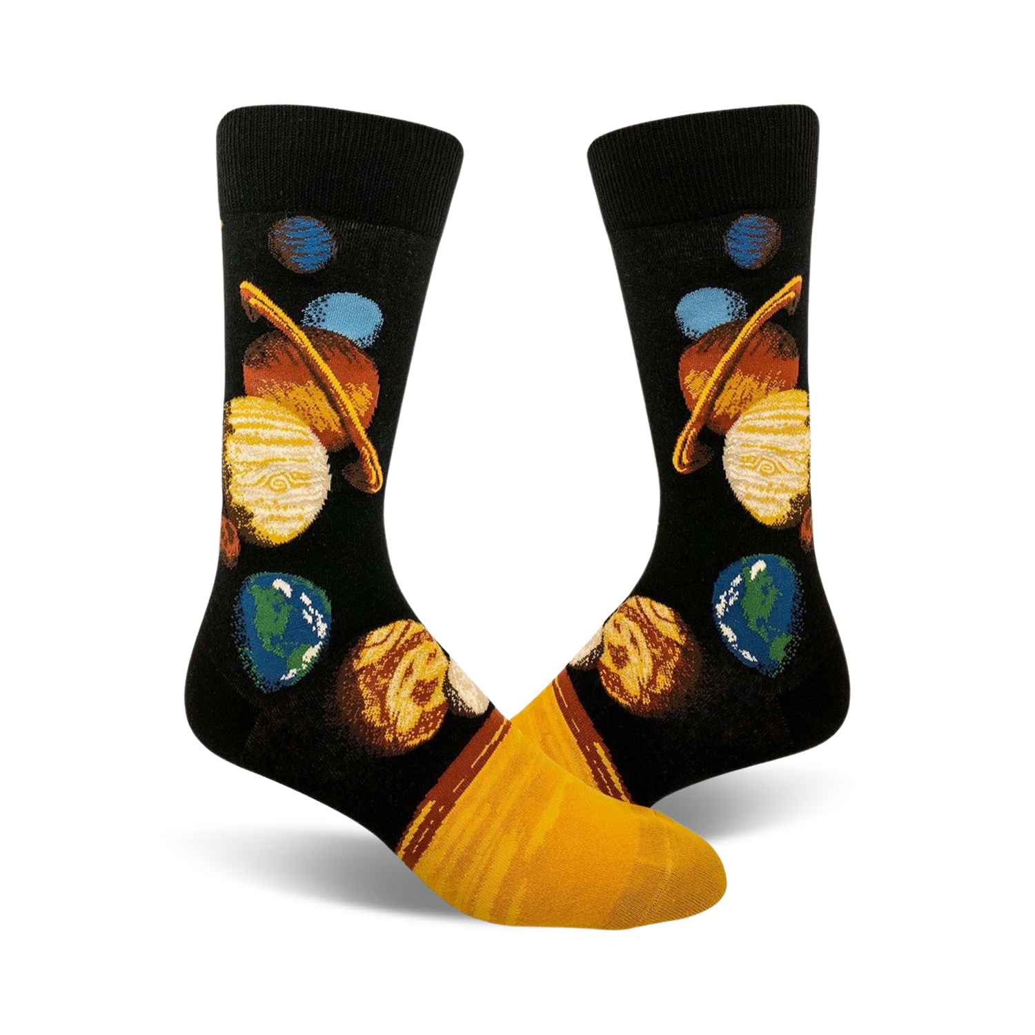 Blast off into stellar fashion with our Solar System socks! Join the crew of Mercury, Venus, Earth, Mars, Jupiter, Saturn, Uranus, Neptune, and Pluto each represented in vibrant hues on these cosmic kicks. Get ready to explore space and serve serious style on your feet. Spice up your wardrobe with these planets that'll make you out of this world!