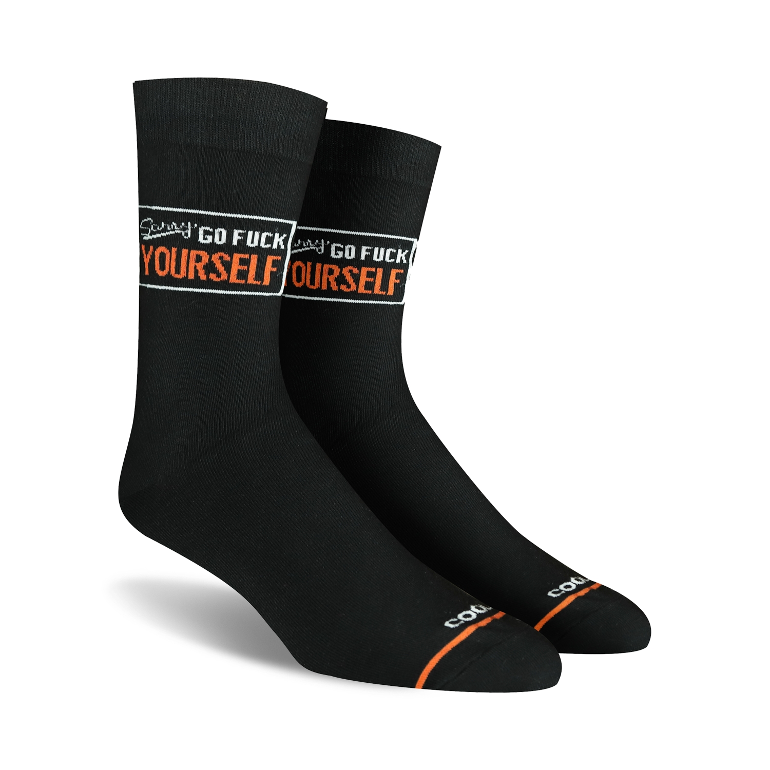 Erupt with laughter and captivate all around you with our "Sorry Go F*ck Yourself" socks. These jet-black canvases sport white and orange lettering that leaves no room for misunderstandings. They're the perfect accessory for when you've reached your limit and just need to let loose. Don't just wear socks, make a statement.