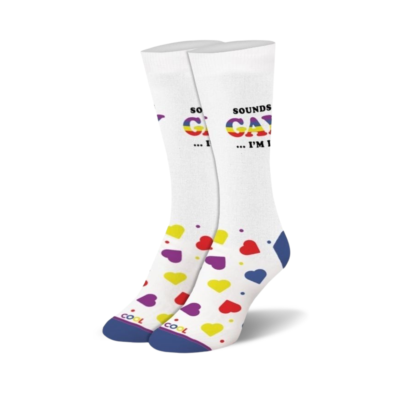 Embrace your fabulousness with these outrageously delightful 'Sounds Gay, I'm In!' socks! Sprinkle your feet with rainbow-colored hearts and a bold declaration of gay pride. These socks are the perfect accessory for any LGBTQIA+ fashionista looking to add a touch of humor and activism to their wardrobe. So, slip into a pair and let your feet do the talking!