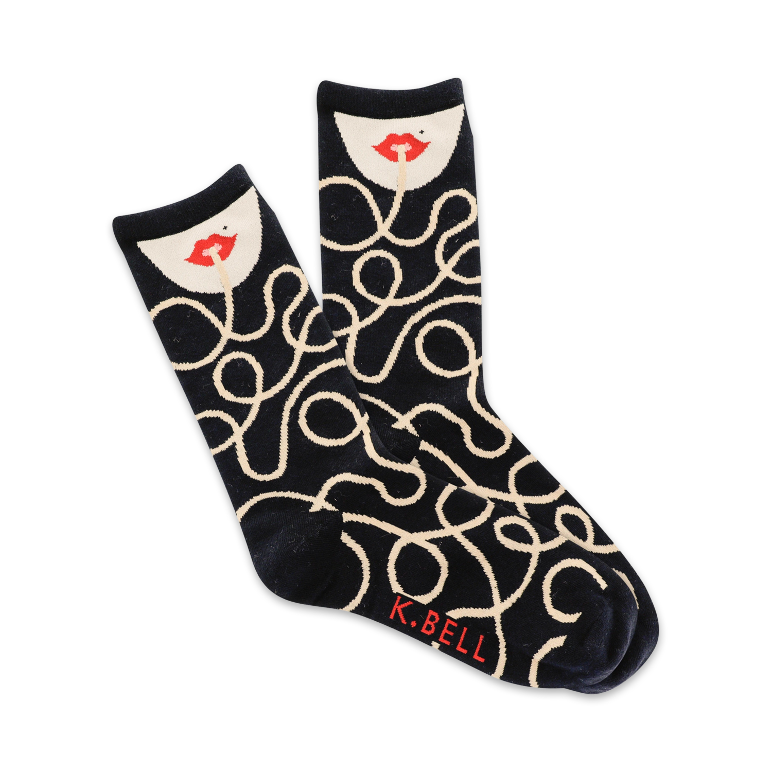 Feast your eyes on our Spaghetti socks! The black and white swirly design looks like a heaping plate of spaghetti. Throw on these crew socks and strut your stuff like the proud noodle you are. And check out that red K. Bell logo ”it's the cherry on top!