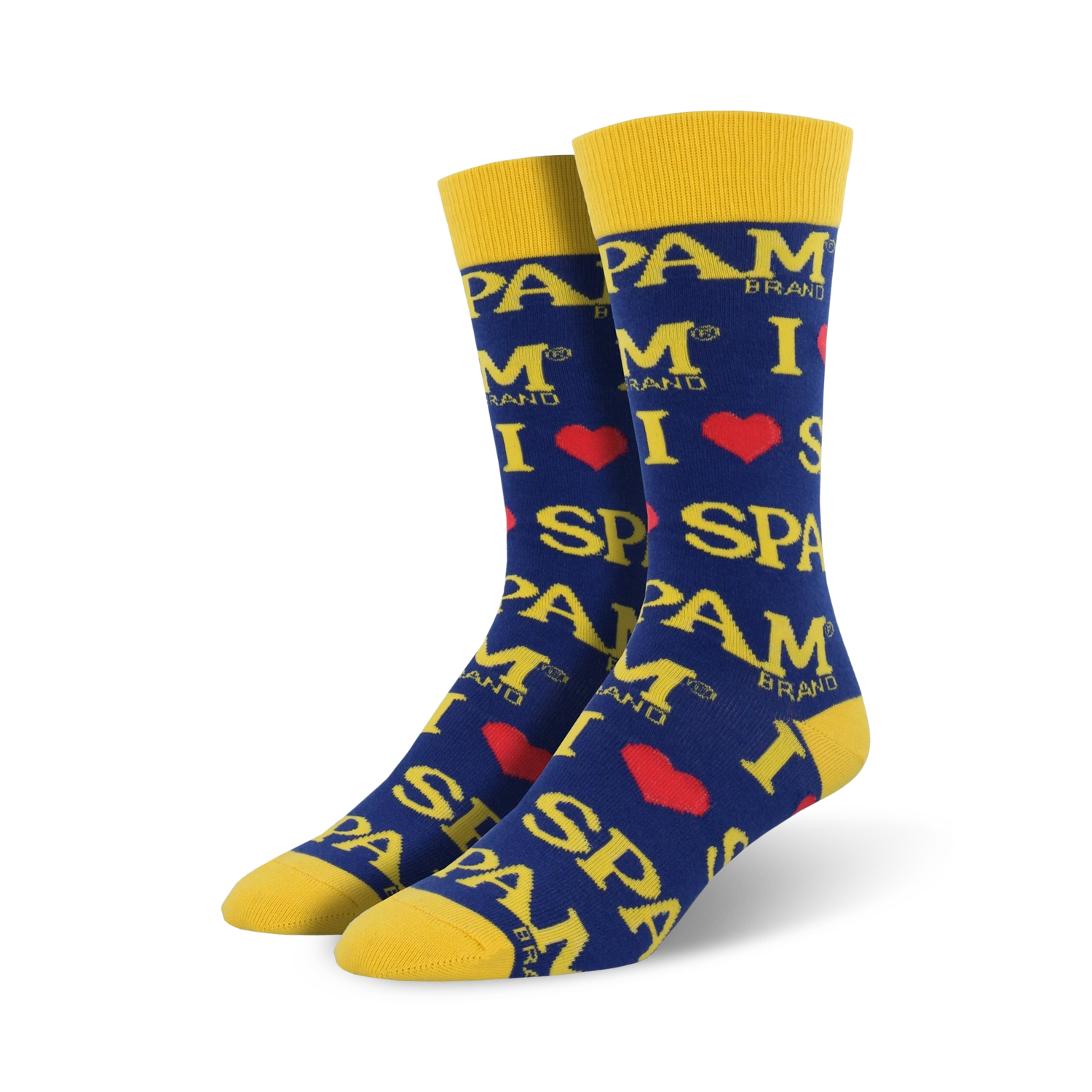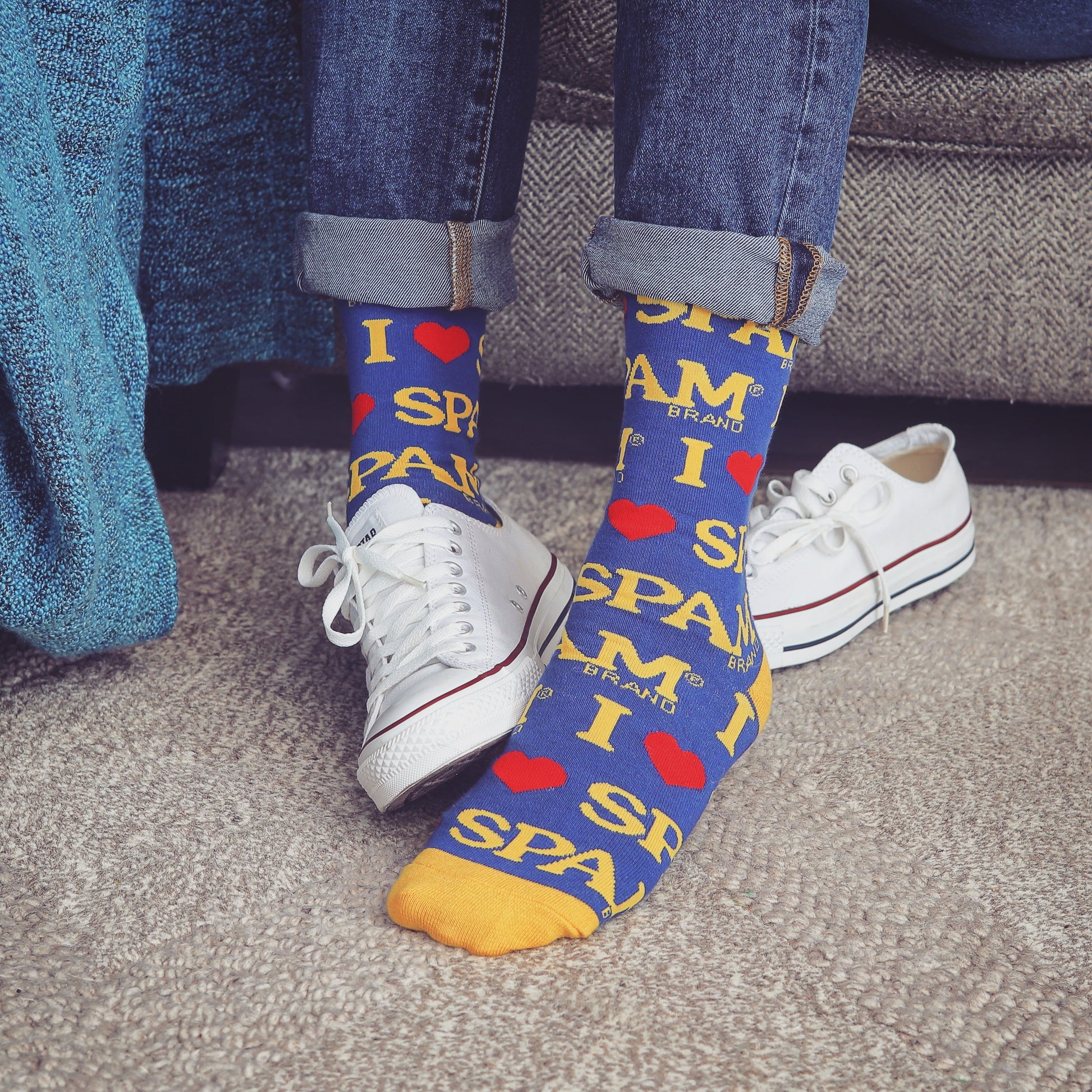 Nobody likes spam mail, but the same can't be said for the deliciously cooked canned meat! This savory pork product has been around for ages and can be cooked in many mouth-watering ways. Be proud of your love for this famous spiced meat and put on a pair of these awesome SPAM socks! There's no mystery about it, these cool novelty socks will make a great gift to any mystery meat lover out there! Each fun pair of yellow and blue crew socks features a pattern phrase that reads "I heart Spam".