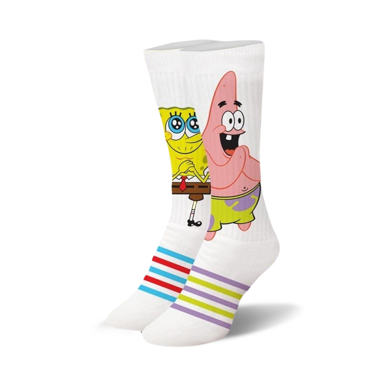 Spongebob Squarepants and his buddy Patrick Star are ready to brighten up your feet with this delightful pair of socks! These white crew socks are adorned with a colorful striped pattern at the top and feature a vibrant design of Spongebob and Patrick smiling and embracing each other. Step into these socks and let the iconic duo bring a touch of whimsy and laughter to your day. Spongebob Pretty Please socks are a playful reminder that friendship is the ultimate treasure.