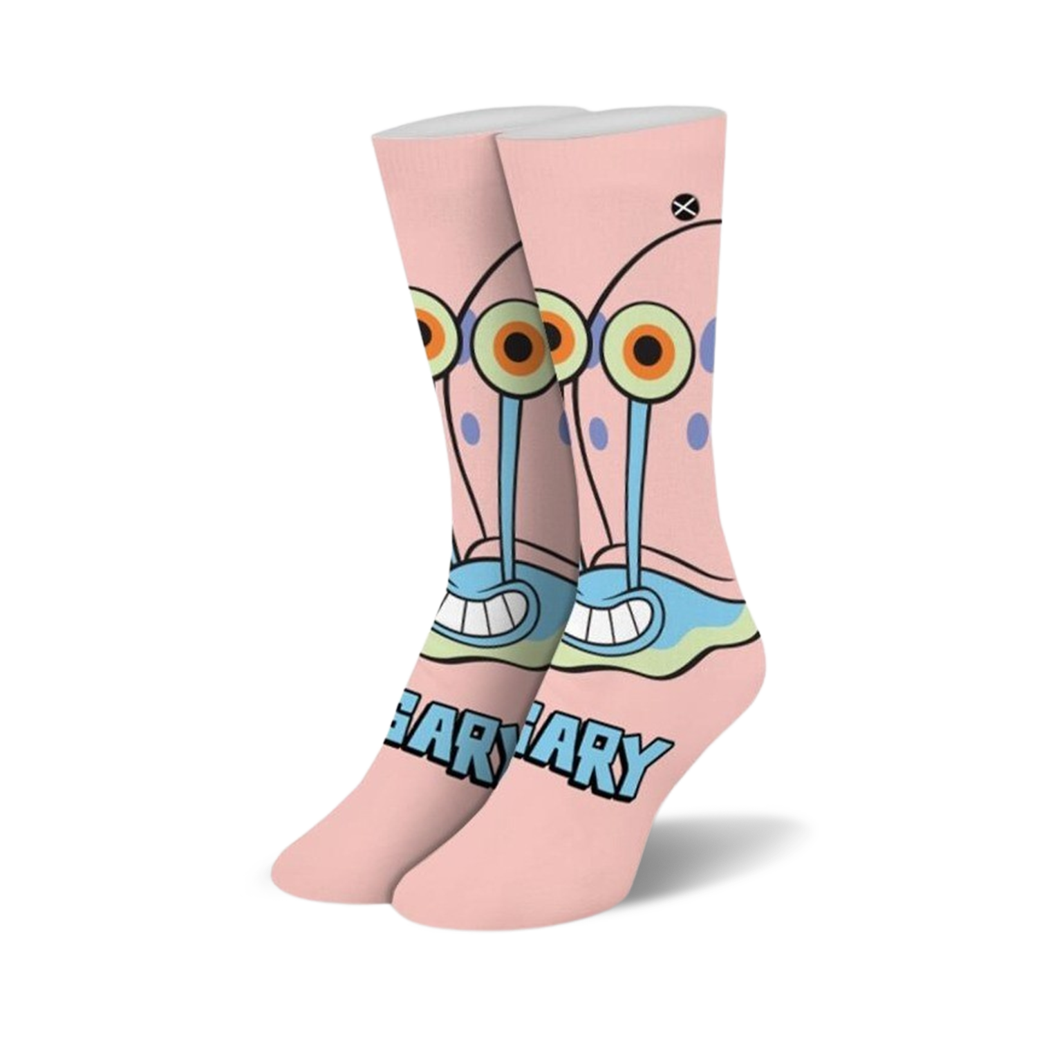 Put some pep in your step with our Spongebob Squarepants Gary The Snail socks! These pink crew socks are covered in images of Gary, the hilarious snail with a blue shell and big eyes. He's always smiling and sticking out his tongue, and he's sure to bring a smile to your face, too. Made of soft cotton, these socks are comfy enough to wear all day long. So slide on a pair of Gary socks and let the fun begin!