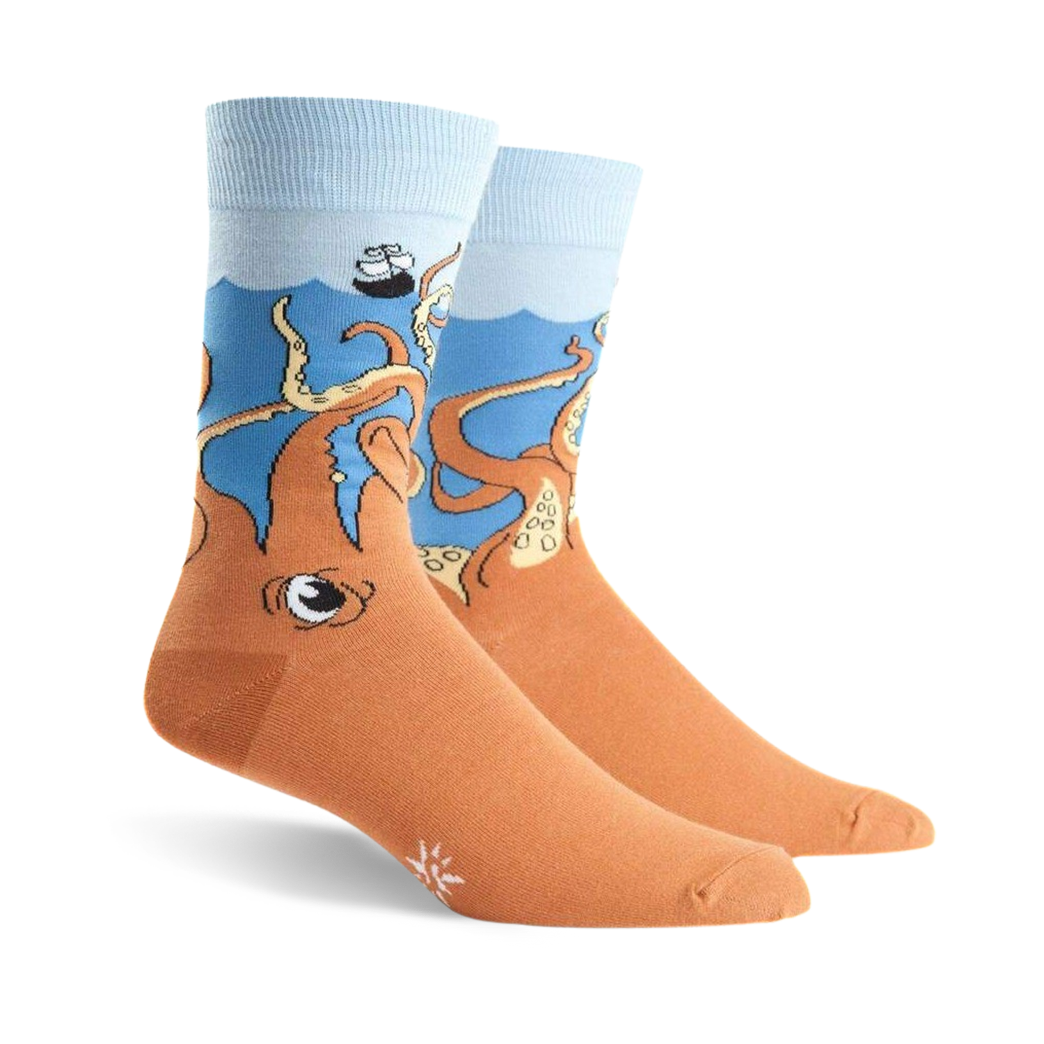 Meet Squid-O, the orange crew socks with a blue toe and heel. Adorned with an adorable orange octopus with big blue eyes, these socks depict the aquatic adventure of Squid-O as he journeys through deep blue waters. Join Squid-O on his underwater explorations and unleash your inner sea adventurer!