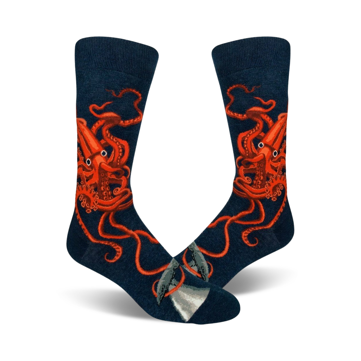 Dive into the deep sea with these "Squid & Whale" socks! Featuring an orange octopus attacking a sperm whale on a dark blue background, these crew-length socks for men are sure to make a splash. Show off your love for the ocean while keeping your feet cozy and stylish
