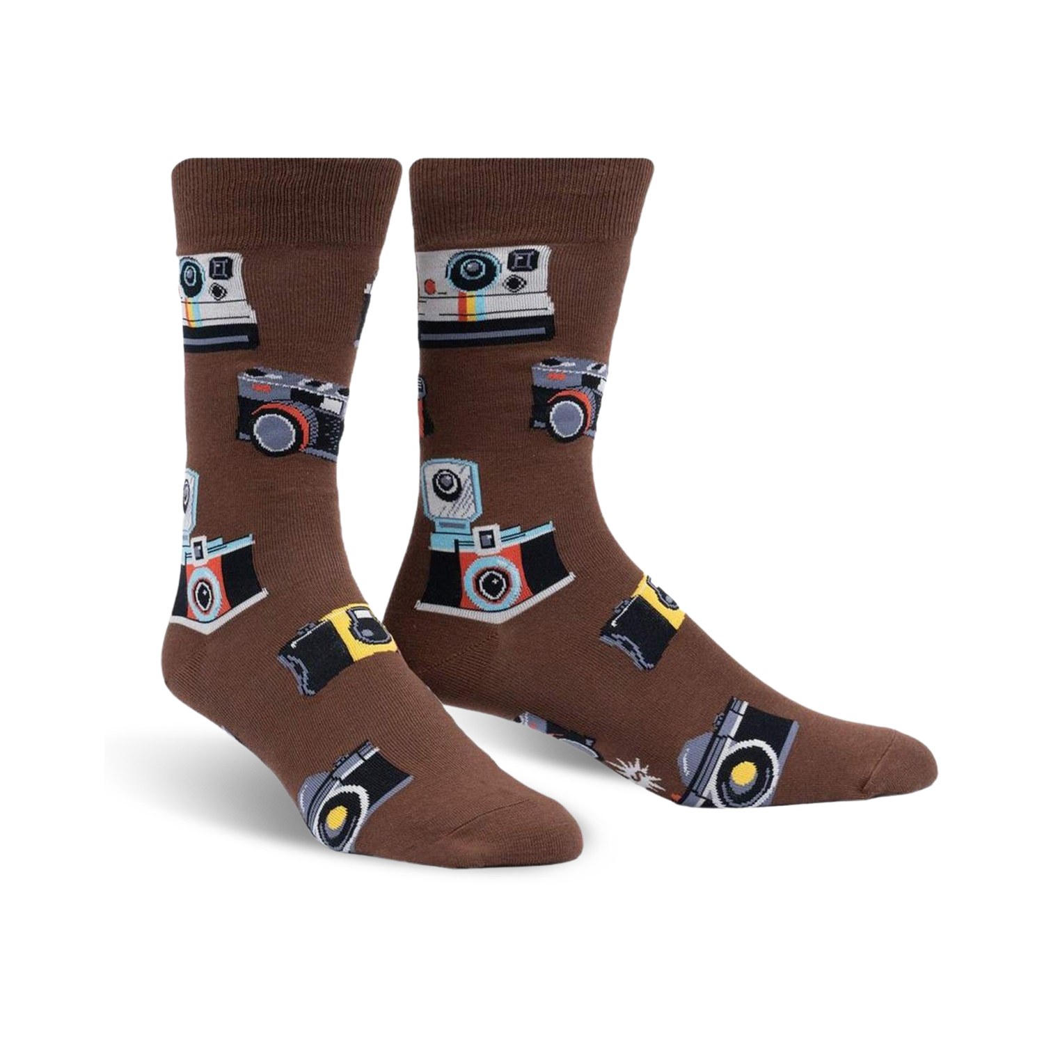 Strike a Pose with Style! These vintage camera-printed crew socks are sure to turn you into the star of the show. With their brown background and vibrant pattern of classic cameras, these socks will make you the center of attention wherever you go.