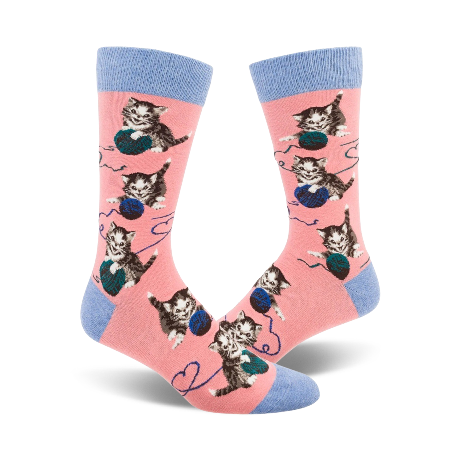 String Cat: These crew length men's socks are purr-fect for any cat lover! The pink socks are splashed with playful kittens frolicking in blue yarn - who knew yarn could be so charming? Slip into a pair of String Cat socks and let the cute kitties keep you company wherever you go!