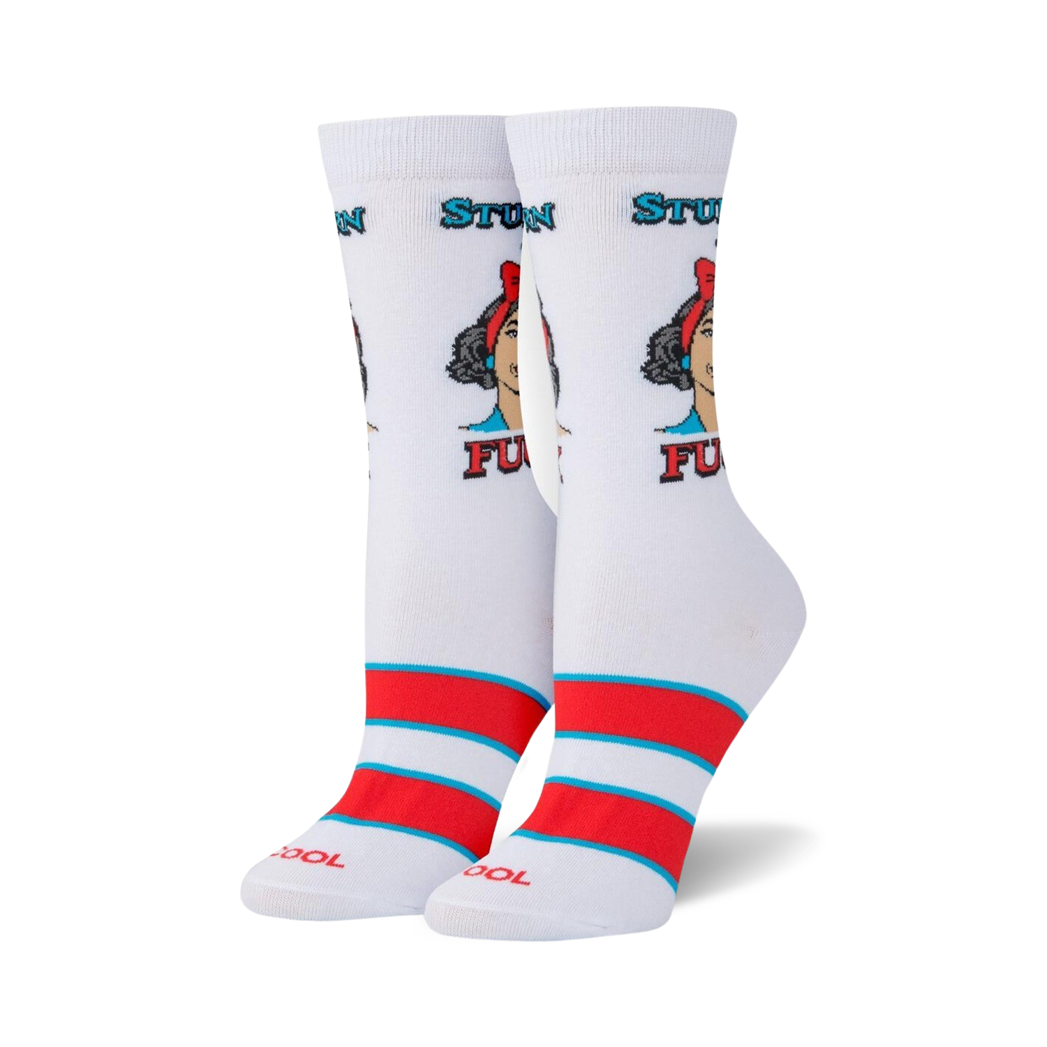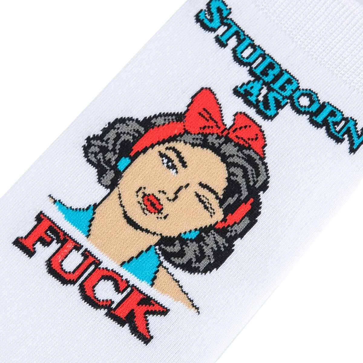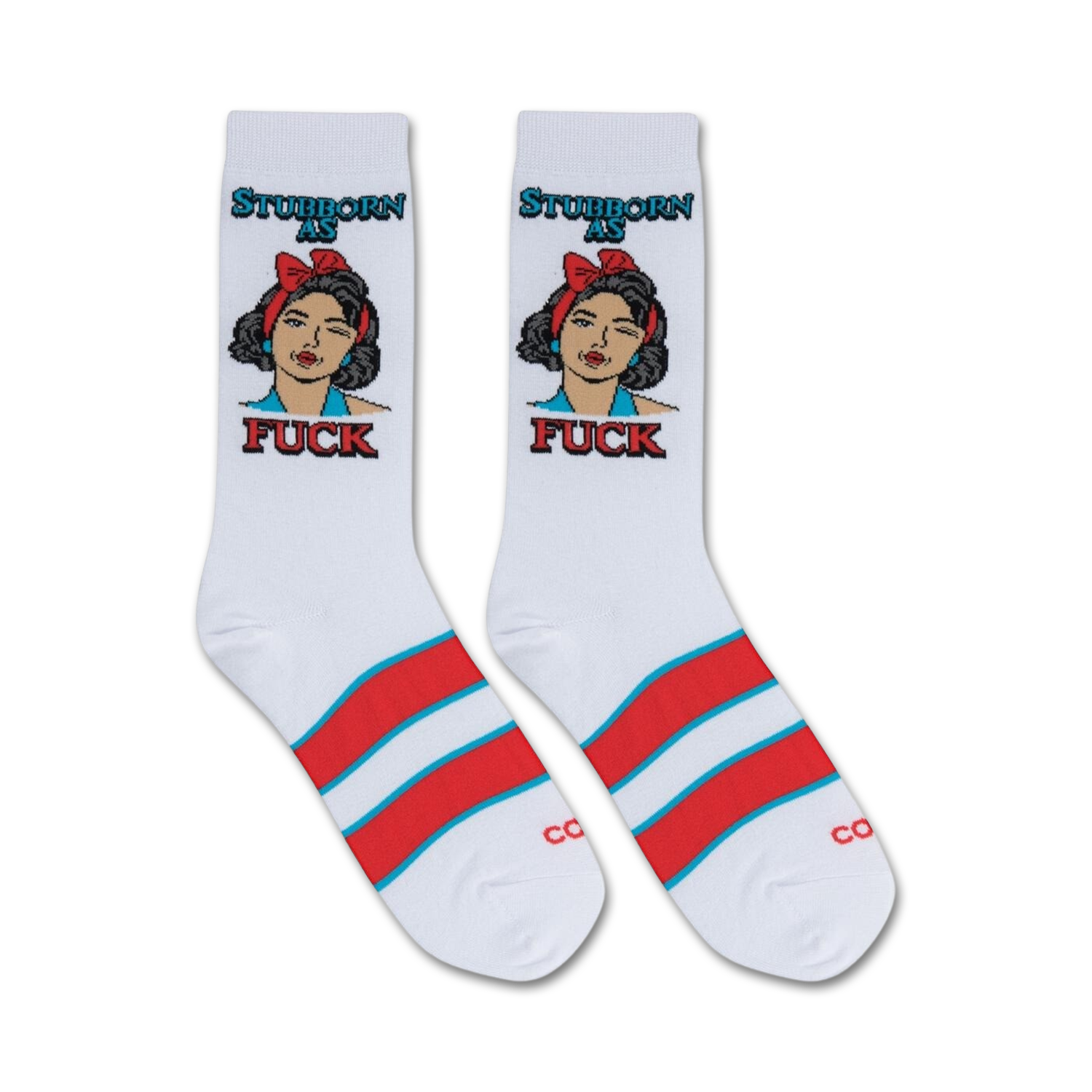 Stubborn women rule the world. Show off your unwavering stubbornness with these "Stubborn AF" socks with a fun repeating pattern of a headstrong, red headband-wearing woman winking at you. The word "fuck" is boldly written below her in black letters. The crew socks have red and white striped cuffs. Strut around and remind everyone that sometimes being stubborn is the best policy.