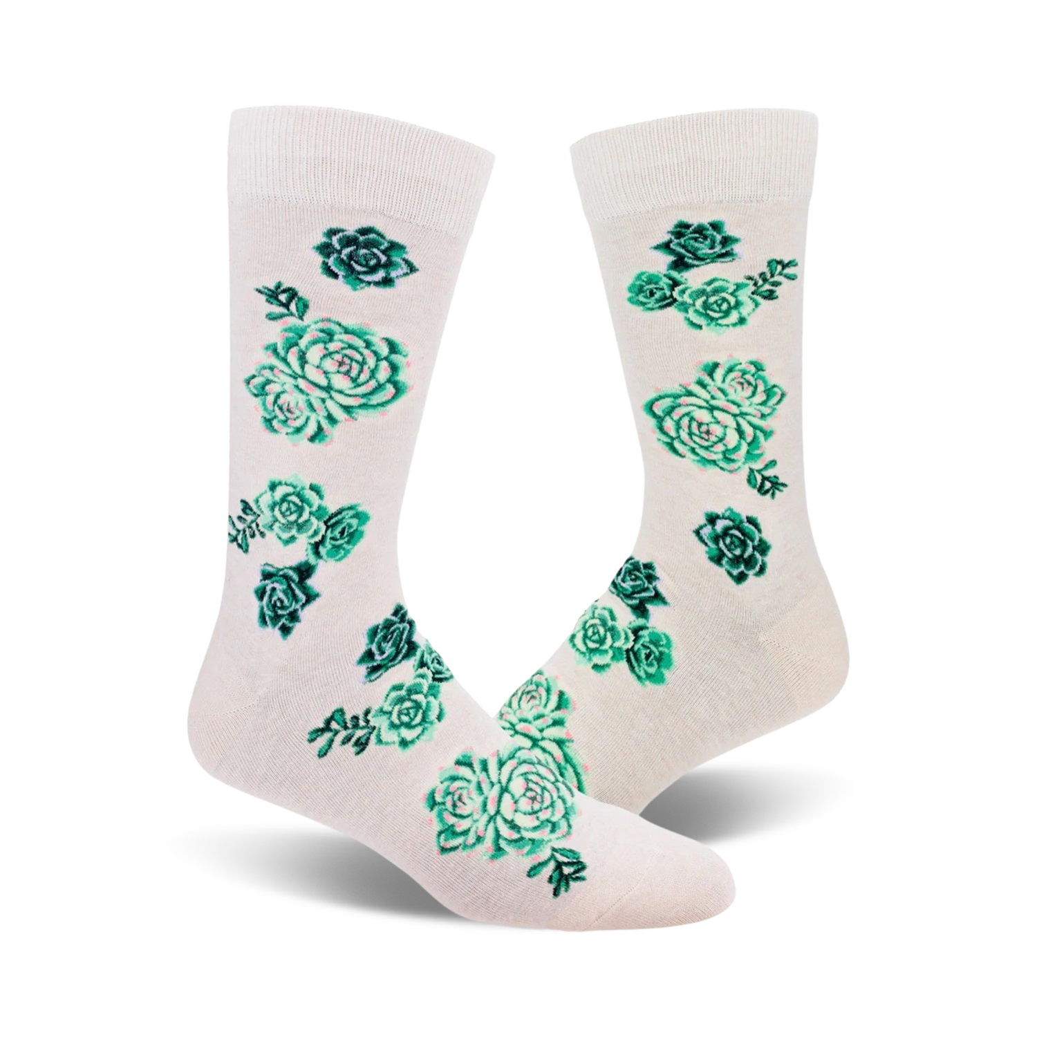 They're like your favorite succulents, green with a little pink, but on socks! These off-white crew socks will add a splash of nature to your wardrobe with a succulent pattern. They might not grow, but they're sure to make your outfit blossom.