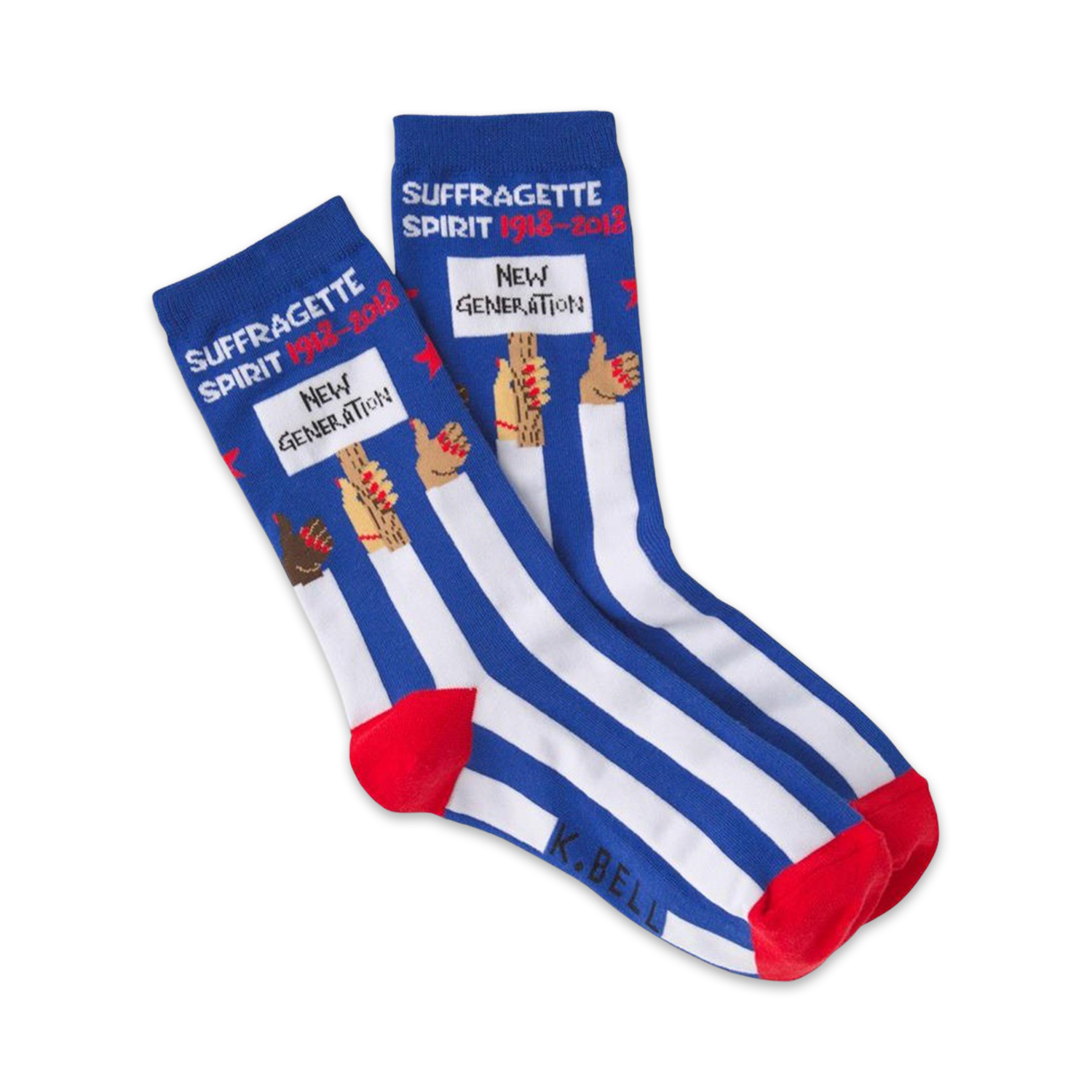 Strike your style chords with these women's Suffragette Spirit socks. Made with a blue background, white stripes, red toes and heels, and the words "Suffragette Spirit 1928-2018 New Generation," these socks are designed to inspire. They feature two hands, one black and one white, doing a fist bump, symbolizing unity and strength. Rock these crew socks to your next protest or rally and let your feet do the talking!
