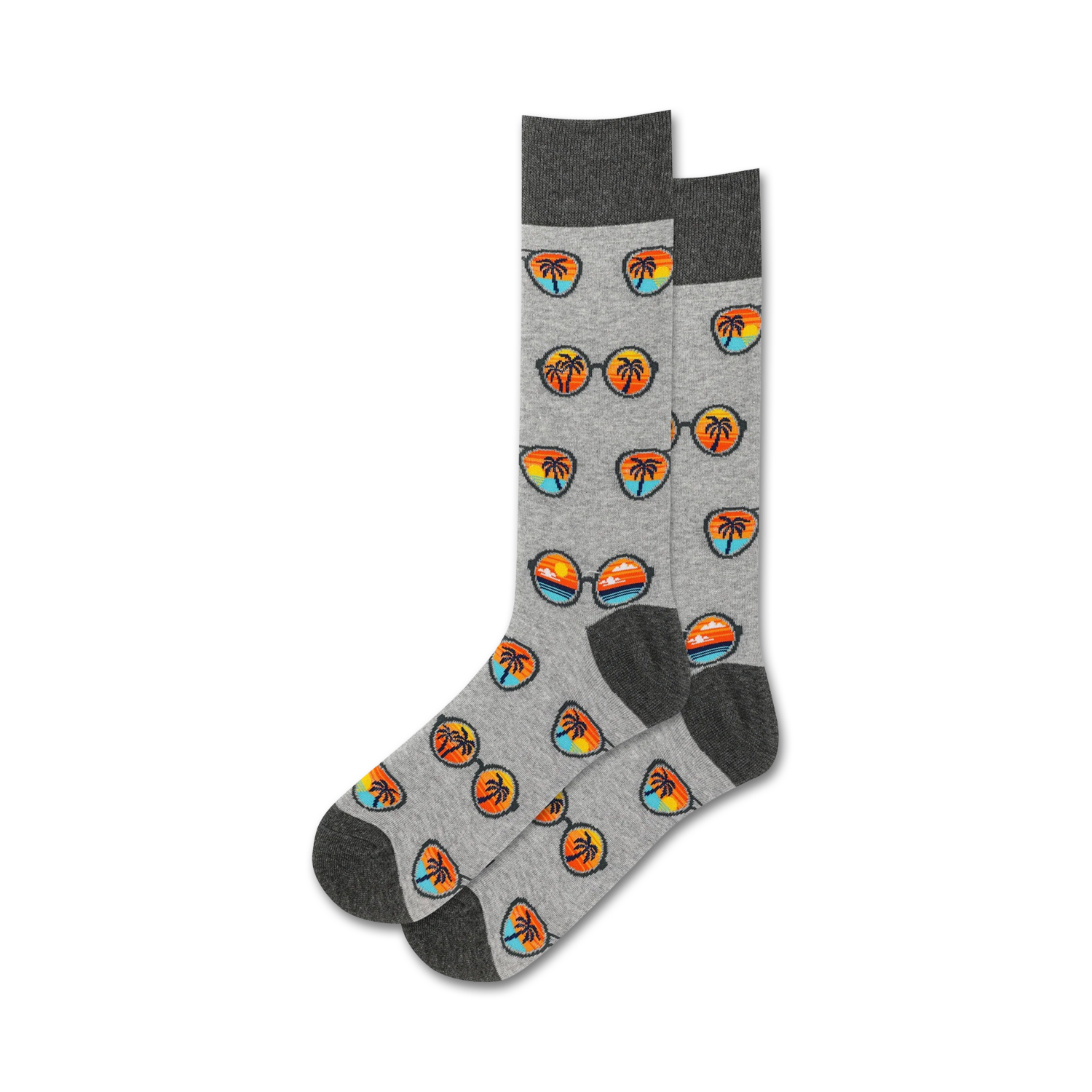 Who needs shades when you've got these cool gray socks with a pattern of orange-framed blue lens sunglasses and green palm trees with brown trunks? The next time you need a laid-back but fashionable sock to keep your feet comfy and stylish, reach for these crew length socks made just for men who love a beachy vibe.