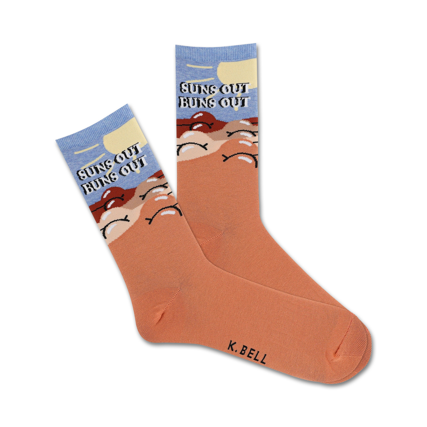 Suns out, buns out! Rock these crew length socks emblazoned with these cheeky words. Whether you're hitting the beach or just lounging poolside, these orange socks with blue toes and heels will keep your feet cool and comfy while showing off your playful side.