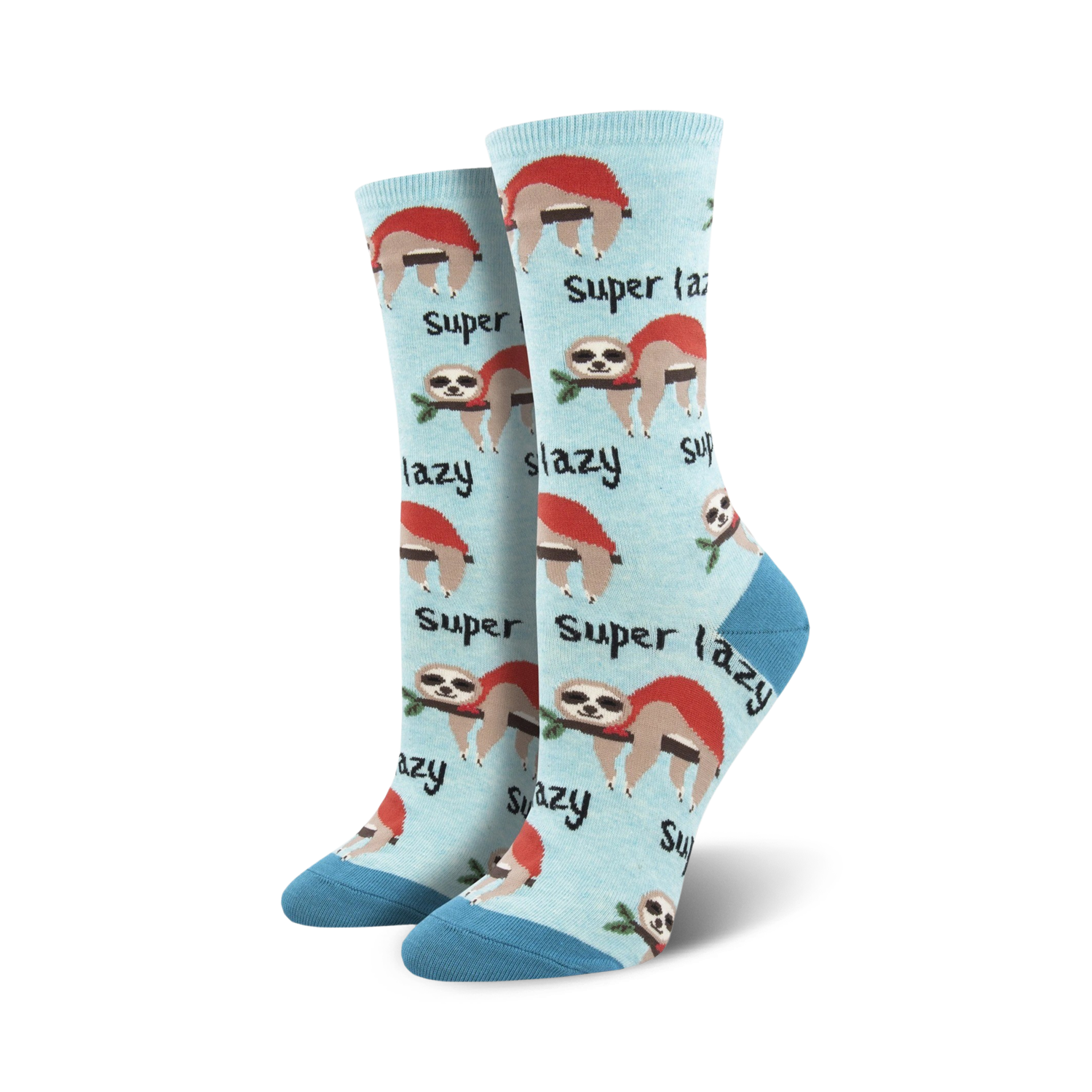 **Super Lazy Sloth Socks:** These crew socks are not just any socks, they're the ultimate in chill vibes! Picture this: a bunch of adorable sloths, hanging upside down from branches, rocking red Santa hats, and the words "Super Lazy" written beside them. Wear these fun socks and channel your inner sloth, reminding you to embrace your own level of relaxed!