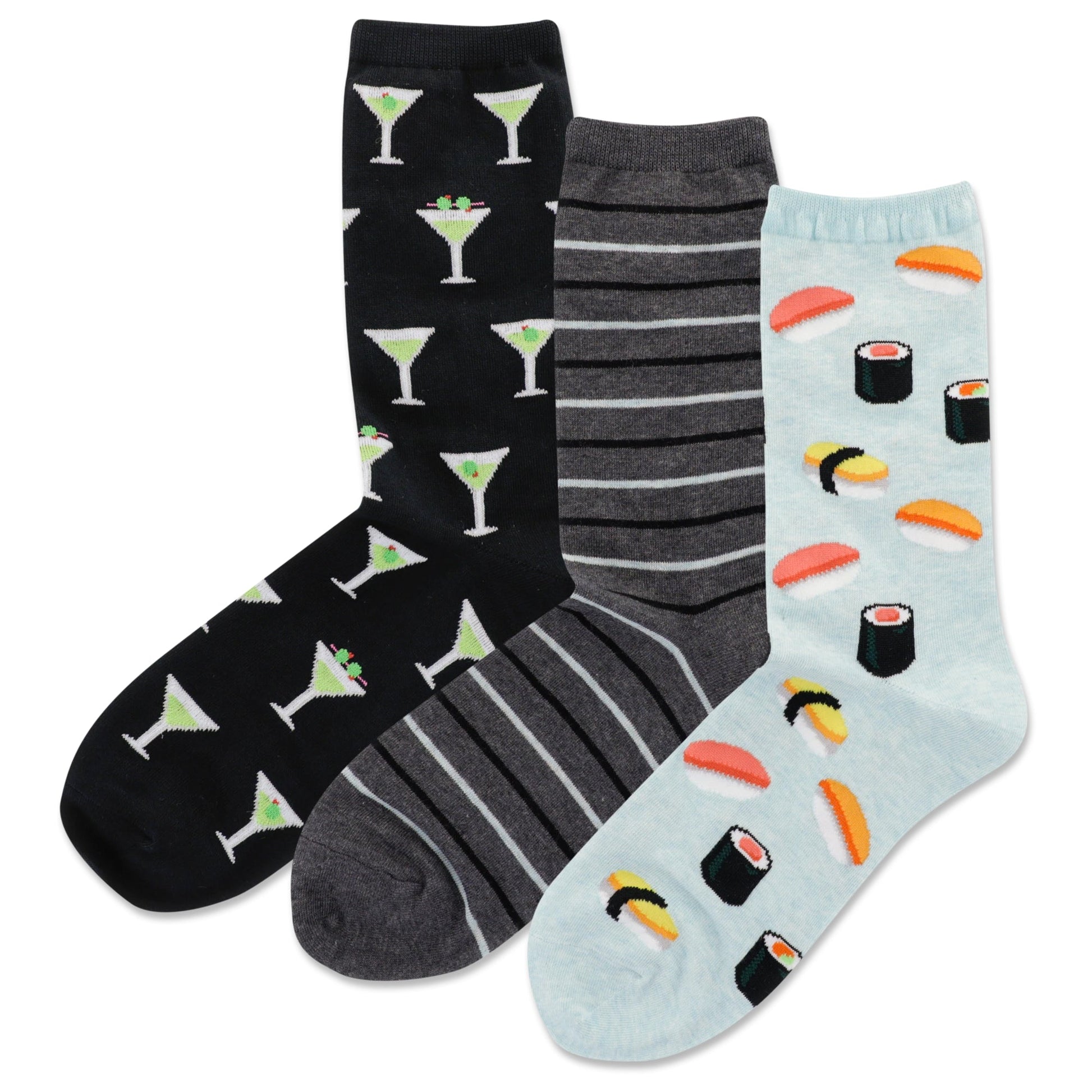 This 'Sushi 3pk' features three pairs of crew socks. One pair shows a repeating pattern of martini glasses on a black background. Another pair has grey and light grey horizontal stripes. The third pair, shown in light blue, has a visible pattern of various sushi pieces. They're fun, comfortable socks- perfect for adding a little personality to your day.