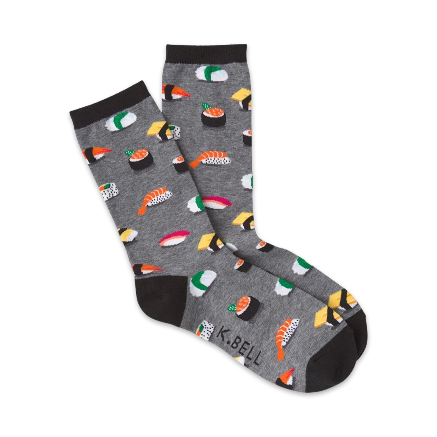 Sushi Socks: Dig In! These crew socks in gray feature a delectable array of sushi favorites, including nigiri, maki, and sashimi. Crafted from soft cotton, with a black toe and heel for an extra dash of style, these socks are the perfect feast for your feet. Fun fact: Did you know that sushi was once considered a fast food in Japan?
