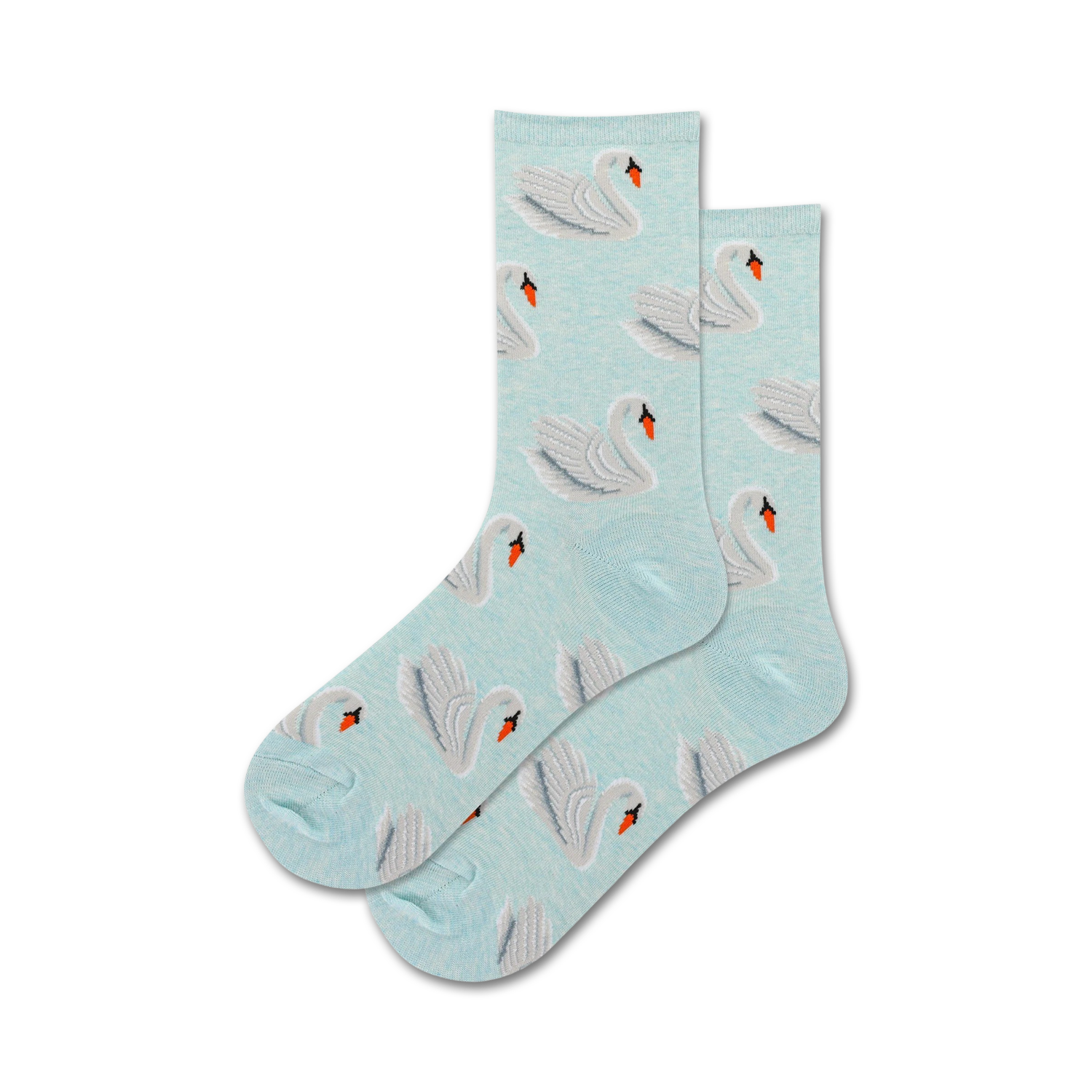 Swan-derful Socks: These light blue crew socks with their pattern of white swans with orange beaks and feet are graceful and ready to take flight. They'll elevate your everyday style and make a flockin' statement.
