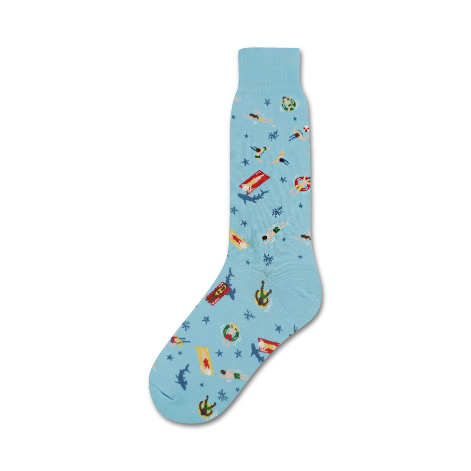Take a dive into a sea of fun with these "Swimmers Swimming" crew socks for men! Join a crew of swimmers, sharks, pool floats, and beach balls frolicking in this cheerful underwater scene. These socks are perfect for any beachgoer, pool shark, or ocean enthusiast. You'll feel like you're on vacation all day long. Disclaimer: Socks do not make you swim faster, but they'll sure make you feel like it!