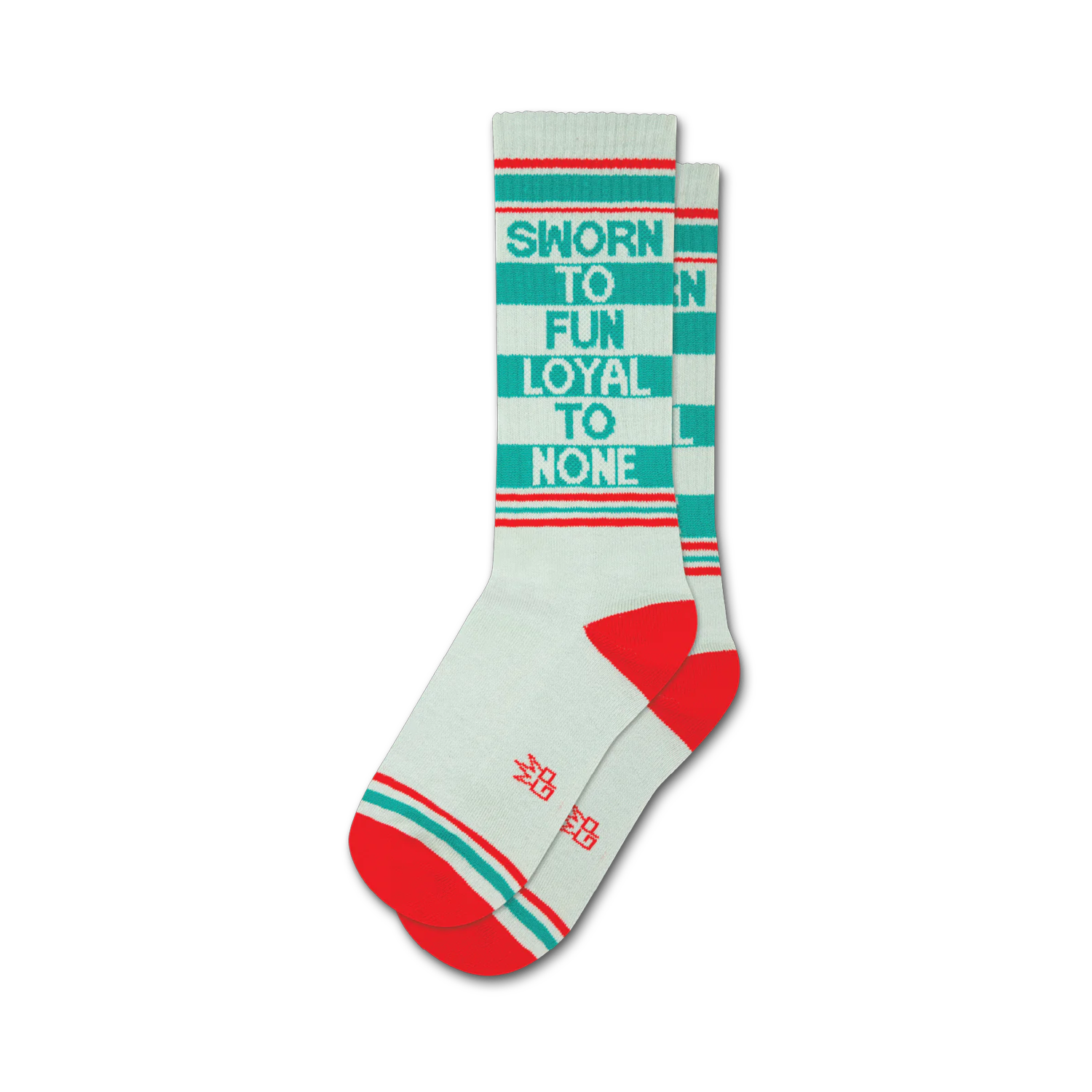 From the land of sass and style comes the 'Sworn To Fun Loyal to None' socks. Adorned with slender red and teal stripes and bold red at the toe and heel, these socks embody the perfect mix of sass and spirit. Each pair features the words 'Sworn To Fun Loyal To None', a mantra that'll have you strutting your stuff with confidence. Perfect for the rebels with a playful side, these socks will add a touch of fun and attitude to your everyday look. Don't miss out on the chance to swear to fun and loyalty - grab a pair today!
